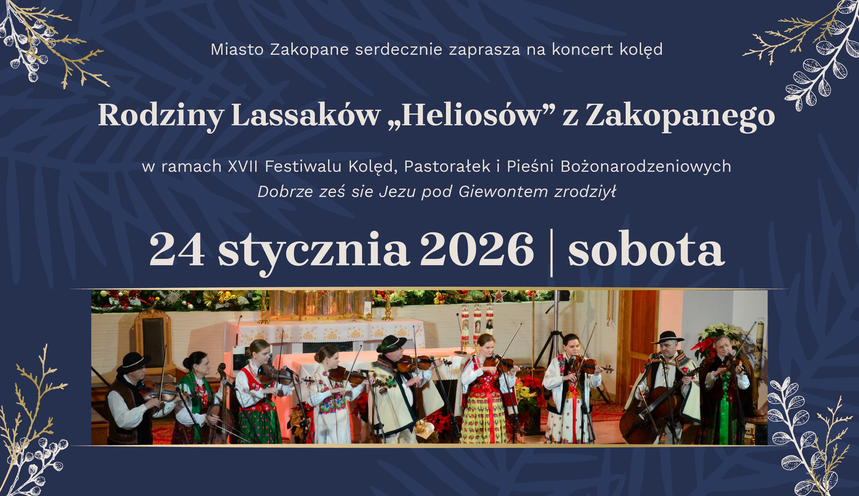 W programie ich sobotniego koncertu znajdą się pastorałki, kolędy i tradycyjne „nuty” góralskie, przeplatane opowieścią o zwyczaju kolędowania na Podhalu „drzewiej i dziś”. Zabrzmią gęśle (skrzypce), basy podhalańskie, piscołki, złóbcoki, dzwonki pasterskie i wielogłosowy śpiew góralski. Muzyka Rodziny Lassaków „Heliosów” wystąpi w składzie: Halina Maciata-Lassak i Tomasz Lassak z córkami Katarzyną Lassak i Anną Lassak, Janina i Janusz Lassak z córkami Heleną Lassak i Michaliną Lassak oraz Stanisław Maciata.