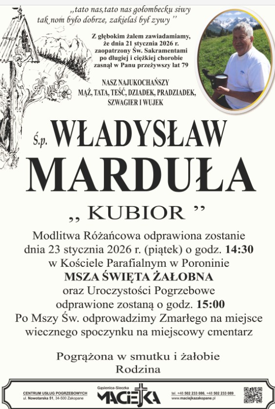2026-01-21 21:30 W Tatrach mniej osób ratowanych przez TOPR 2026-01-21 21:00 Pierwsza noworoczna akcja zbiórki krwi zakończyła się wyśmienicie 2026-01-21 20:00 Szkoły w Spytkowicach z nowym sprzętem komputerowym 2026-01-21 19:30 Poetyckie spotkanie w Ratuszu 2026-01-21 19:00 Koncert Laureatów XXXI Przeglądu Kolęd i Pastorałek w Ludźmierzu 2026-01-21 19:00 Coraz więcej turystów w Zakopanem (WIDEO) 2 2026-01-21 18:00 Kolędowanie z rodziną Lassaków "Heliosów" z Zakopanego 2026-01-21 16:00 Są pieniądze na budowę Podhalańskiego Centrum Nauki, Techniki i Nowych Technologii w Czarnym Dunajcu 4 2026-01-21 15:41 Wypadek na budowie w Skawie 2026-01-21 15:00 Wystartowała czwórka zawodników z Podhala, zgarnęli dwa medale 2026-01-21 14:30 Schronisko PTTK w Dolinie Pięciu Stawów gra dla WOŚP 4 2026-01-21 14:00 To nie pobór ani mobilizacja, szykujcie się do kwalifikacji wojskowej 4 2026-01-21 13:30 Babciu, dziadku opowiedz. Spotkanie międzypokoleniowe 2026-01-21 13:00 Mieszkańcy i turyści na Podhalu dostają alerty RCB. Chodzi o zanieczyszczenie powietrza 6 2026-01-21 12:31 Licytuj noclegi w schronisku PTTK na Hali Krupowej 2026-01-21 12:00 Niepowtarzalna panorama z Kopieńca. W Tatrach cieplej niż na Podhalu (WIDEO) 2026-01-21 11:30 Chcesz spędzić dzień z ratownikami TOPR? Jest wyjątkowa okazja 4 2026-01-21 11:01 Wieża widokowa na Górze Parkowej oficjalnie otwarta - od wehikułu czasu, przez retro atrakcje ośrodka Grupy PKL po zupełnie nową perspektywę 2026-01-21 11:00 Zorza nad Chochołowem 1 2026-01-21 10:28 Zakopiańscy uczniowie pomogą WOŚP na sportowo 2 2026-01-21 10:00 Pierwsza w tym roku Parada Gazdowska odbędzie się w Zębie 1 2026-01-21 09:30 Blisko milion złotych na bezpieczeństwo mieszkańców Krościenka 2 2026-01-21 09:00 Finał WOŚP w Resort Terma Bania w Białce Tatrzańskiej 13 2026-01-21 08:00 Więcej noclegów, więcej turystów. Podhale ostrożnie zadowolone 11 2026-01-20 21:30 Uwaga kierowcy, w czwartek możliwe utrudnienia na zakopiance w Rdzawce 2026-01-20 21:00 Orawskie Kilimandżaro 2026-01-20 20:00 Gościsz turystów? Masz obowiązek zamontować czujki dymu i czujki czadu w pomieszczeniach 5 2026-01-20 19:30 Zorza była po prostu niesamowita 1 2026-01-20 19:00 Gdy na stację w Zakopanem przyjeżdża pociąg (WIDEO) 4 2026-01-20 18:35 Wspaniały drugi przejazd Maryny Gąsienicy Daniel 2026-01-20 18:00 Listy-widma, awiza bez listów i urzędowa cisza. Poczta Polska sparaliżowała Poronin 12 2026-01-20 17:30 Mozaika zjawisk i znaczeń w Kawiarni Muzealnej 2026-01-20 17:01 Bez prawa jazdy, za to z mefedronem 1 2026-01-20 16:30 Rozsypała się tęcza na hali... 2026-01-20 16:00 Zamiast zatrzymać wandala znaleźli maszyny do gier hazardowych 2026-01-20 15:24 Tak się robi śnieg na Równi Krupowej, górki saneczkowe przeżywają oblężenie (WIDEO) 4 2026-01-20 15:05 Podhale mówi "nie" likwidacji Nadzoru Wodnego. Samorządy ostrzegają przed paraliżem administracyjnym 2 2026-01-20 14:01 Burmistrz: Takie zdarzenie nie powinno mieć miejsca, nie dostaliśmy zgłoszenia 28 2026-01-20 13:00 Pies z ul. Nędzy Kubińca ma już odpowiednie warunki 3 2026-01-20 12:30 IstoTA. Wernisaż w Muzeum Podhalańskim 2026-01-20 12:00 Za nami kolejny mroźny poranek na Podhalu. W Tatrach inwersja (WIDEO) 2026-01-20 11:30 Obrazy na szkle Janiny Maślanki w Czerwonym Dworze 2026-01-20 11:00 Na policję nie wpłynęło żadne zgłoszenie dotyczące filmu dla dorosłych z Krupówek 3 2026-01-20 10:00 Ważny apel sołtysa z Zębu - zabierzcie psy w ciepłe miejsce 4 2026-01-20 09:01 Kiermasz ciast i orkiestrowy koncert w Krempachach 1 2026-01-20 08:00 Trzy takty zawsze dogramy. Rozmowa z dyrygentką Agnieszką Kreiner 2026-01-19 22:43 Piękna zorza widoczna nad Podhalem (WIDEO) 7 2026-01-19 21:20 Pożar sadzy na Butorowym Wierchu 2 2026-01-19 20:30 Samochód na zagranicznych numerach omal nie rozjechał dzieci na przejściu dla pieszych 9 2026-01-19 19:59 Historyczny debiut UKS Halny Zakopane. Awans do IV ligi już na starcie
