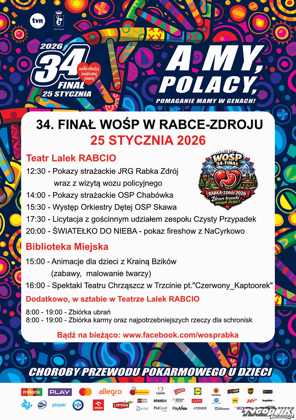 Rabka-Zdrój po raz kolejny włączy się w największą akcję charytatywną w Polsce. Centrum finałowych działań będzie Teatr Lalek "Rabcio", gdzie od południa rozpoczną się liczne atrakcje. O godz. 12.30 odbędą się pokazy strażackie. Później zaplanowano występy Orkiestry Dętej OSP Skawa. W godzinach 17.30-20 licytacja z zespołem „Czysty Przypadek”. O godz. 20 - Światełko do Nieba. Z kolei w Miejskiej Bibliotece Publicznej od godz. 15 zaplanowano animacje dla dzieci z Krainą Bzików, a o godz. 16 występ Teatru Chrząszcz w Trzcinie.