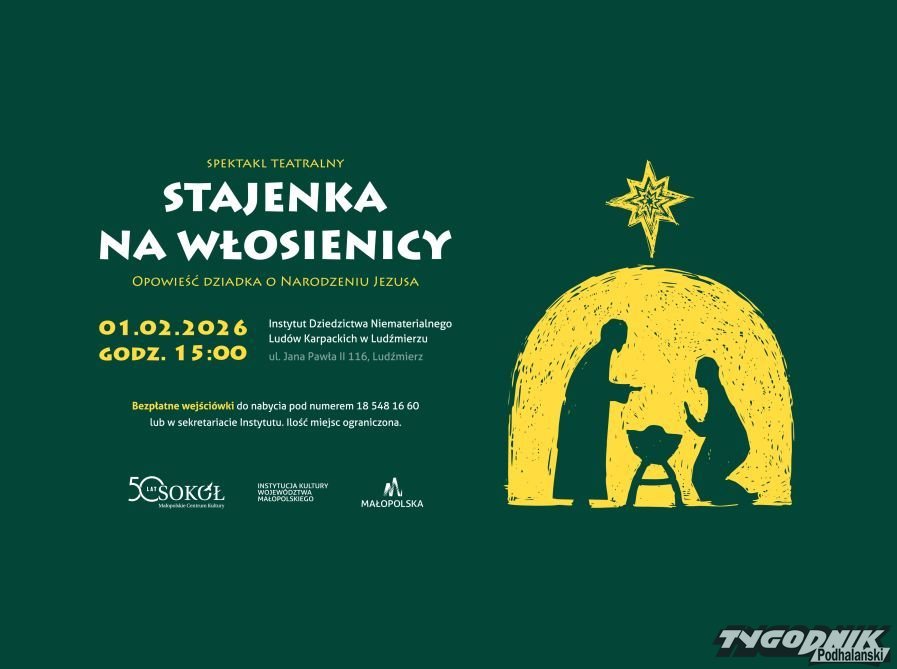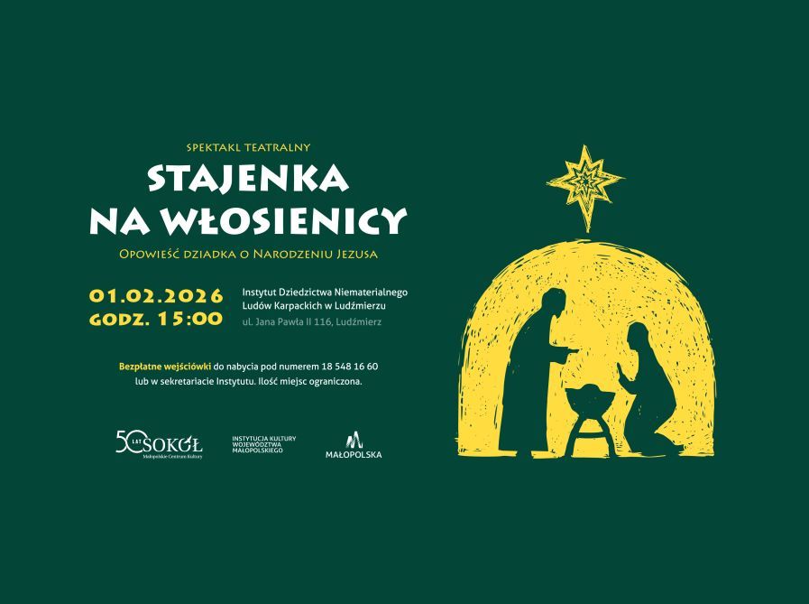 Pierwszy pokaz widowiska "Stajenka na Włosienicy. Opowieść dziadka o narodzeniu Jezusa" w Instytucie Dziedzictwa Niematerialnego Ludów Karpackich w Ludźmierzu odbył się 9.01. Ze względu na duże zainteresowanie oraz brak dostępnych wejściówek na spektakl w wykonaniu Zespołu Regionalnego Zbójnicek z Zębu, Małopolskie Centrum Kultury SOKÓŁ organizuje dodatkowy pokaz w niedzielę 1.02.