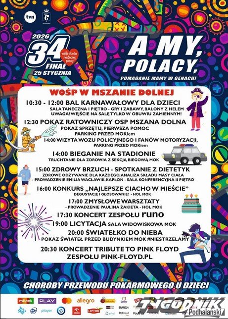 O godzinie 10:30 odbędzie się bal karnawałowy dla najmłodszych, od 12:30 na parkingu przed MOK-iem będzie można zobaczyć pokaz ratowniczy OSP Mszana Dolna oraz prezentację sprzętu. O godzinie 14:00 zaplanowano wizytę wozu policyjnego oraz aktywność sportową - "Bieganie na stadionie" z sekcją biegów górskich i długodystansowych MOK.