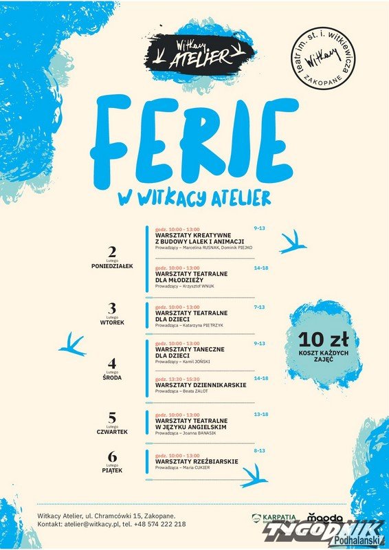 •13:30 – 15:30 Warsztaty dziennikarskie, Wiek uczestnika: 14 -18, Prowadząca: Beata Zalot, Witkacy Atelier, ul. Chramcówki 15, Koszt 10 zł