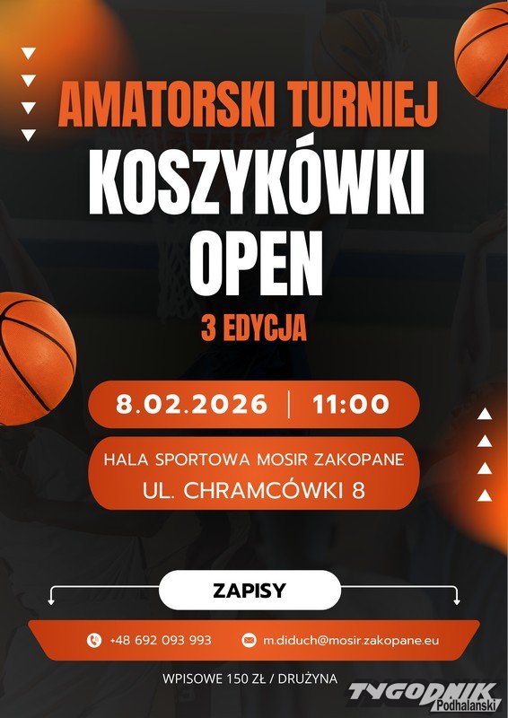 •11:00 Amatorski Turniej Koszykówki OPEN 3 edycja Hala Sportowa MOSIR ul. Chramcówki 8, wpisowe Zapisy: m.diduch@mosir.zakoane.eu,