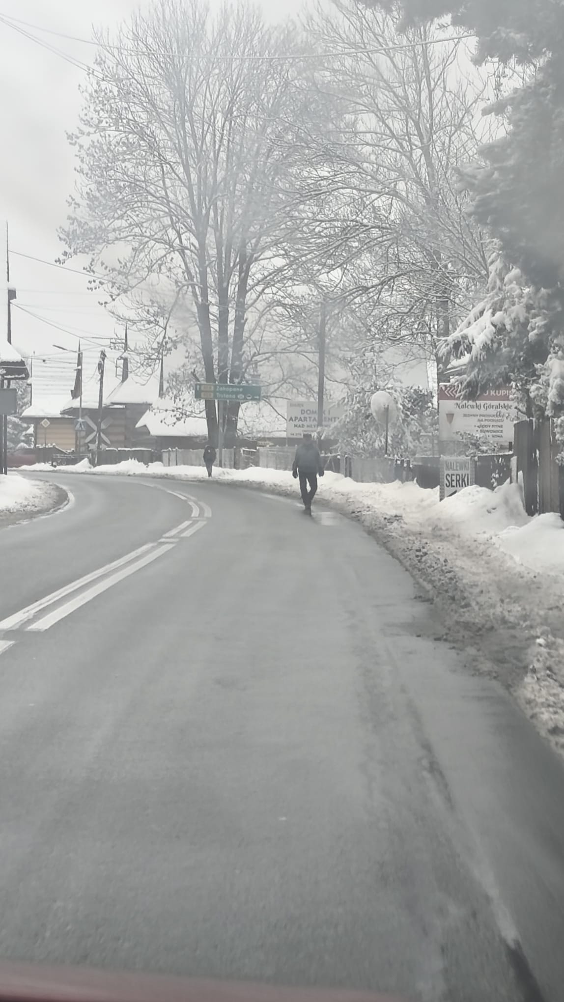 Nieodśnieżone chodniki w Chochołowie. Piesi zmuszeni do chodzenia jezdnią