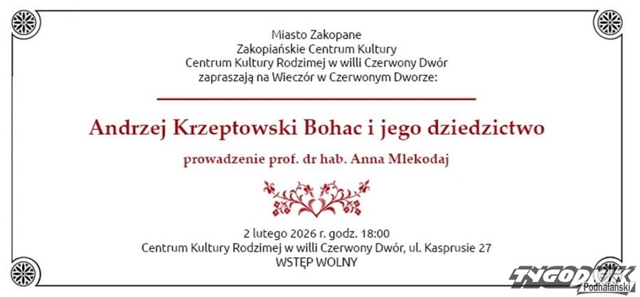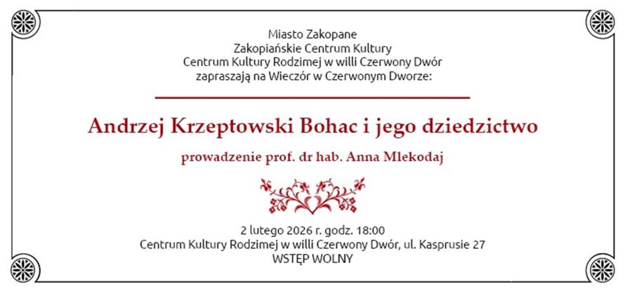 Na "Wieczór w Czerwonym Dworze" zatytułowany "Andrzej Krzeptowski Bohac i jego dziedzictwo" zapraszamy zatem w poniedziałek 2.02 o godzinie 18 (ul. Kasprusie 27).