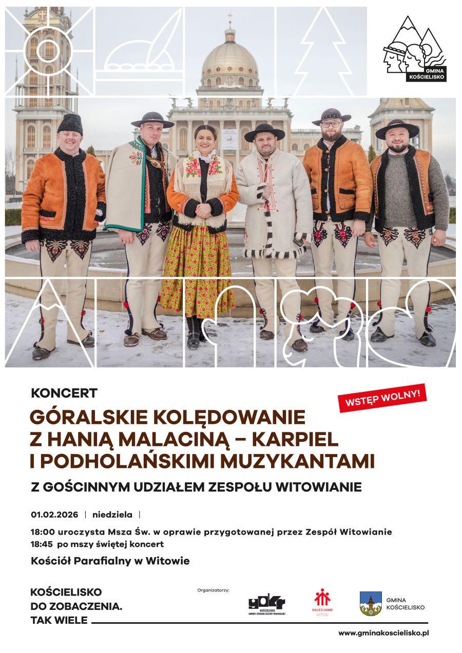 Koncert pastorałek góralskich i nie tylko usłyszymy w niedzielę 1 lutego po Mszy Świętej o godzinie 18 (ok. godz.18:45) w urokliwym wnętrzu kościoła pod wezwaniem Matki Bożej Szkaplerznej w Witowie.