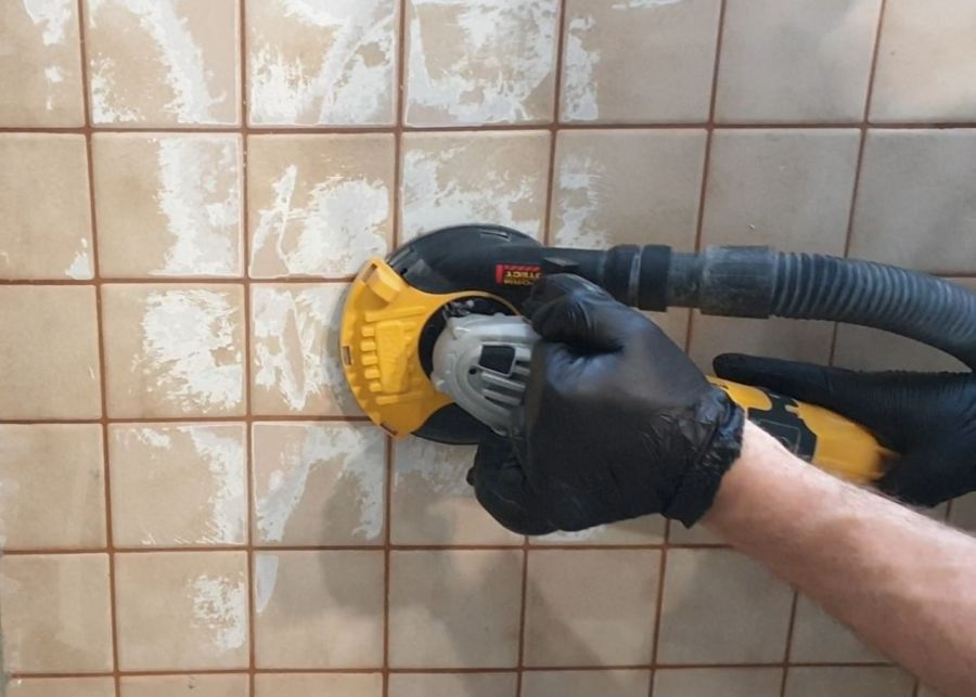 Proces rozpoczyna się od dokładnego oczyszczenia powierzchni. Usuwane są zabrudzenia, tłuszcze, osady z detergentów oraz luźne fragmenty fug. Następnie płytki są matowione / szlifowane mechanicznie, przy pomocy szlifierki kątowej wyposażonej w widiową tarczę garnkową, co poprawia przyczepność oraz niweluje nierówności. Kolejnym etapem jest odpylenie i gruntowanie odpowiednim preparatem systemowym PRIMER C, który zapewnia przyczepność i ujednolica chłonność.