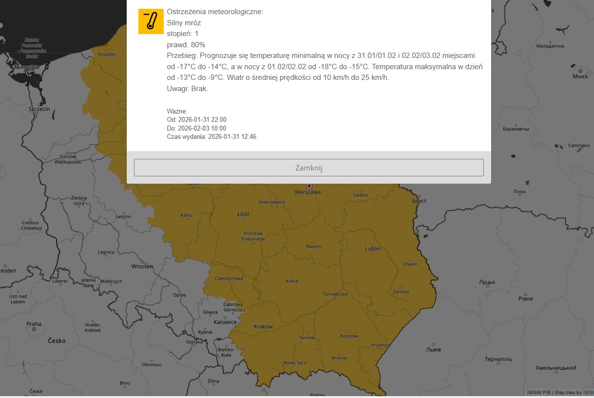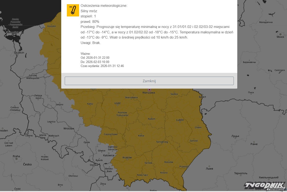Na Podhalu i tak temperatura będzie wyższa niż w centralnej czy północno-wschodniej Polki. I tak jednak Instytut Meteorologii i Gospodarki Wodnej wydał ostrzeżenia pierwszego stopnia przed silnym morzem dla powiatu tatrzańskiego i nowotarskiego. Ostrzeżenie obowiązuje od godz. 22 w sobotę 31 stycznia do godz. 10 we wtorek 3 lutego: "Prognozuje się temperaturę minimalną w nocy z 31.01/01.02 i 02.02/03.02 miejscami od -17°C do -14°C, a w nocy z 01.02/02.02 od -18°C do -15°C. Temperatura maksymalna w dzień od -13°C do -9°C. Wiatr o średniej prędkości od 10 km/h do 25 km/h.