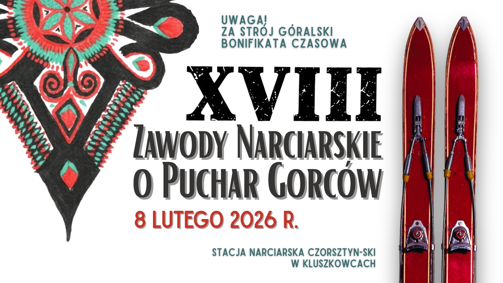 Związek Podhalan Oddział Kluszkowce, Ośrodek Narciarski Czorsztyn-Ski, Gmina Czorsztyn oraz Centrum Kultury Gminy Czorsztyn zapraszają na XVIII Zawody Narciarskie o Puchar Gorców, które odbędą się w niedziele 8.02 na stoku Czorsztyn-Ski w Kluszkowcach.