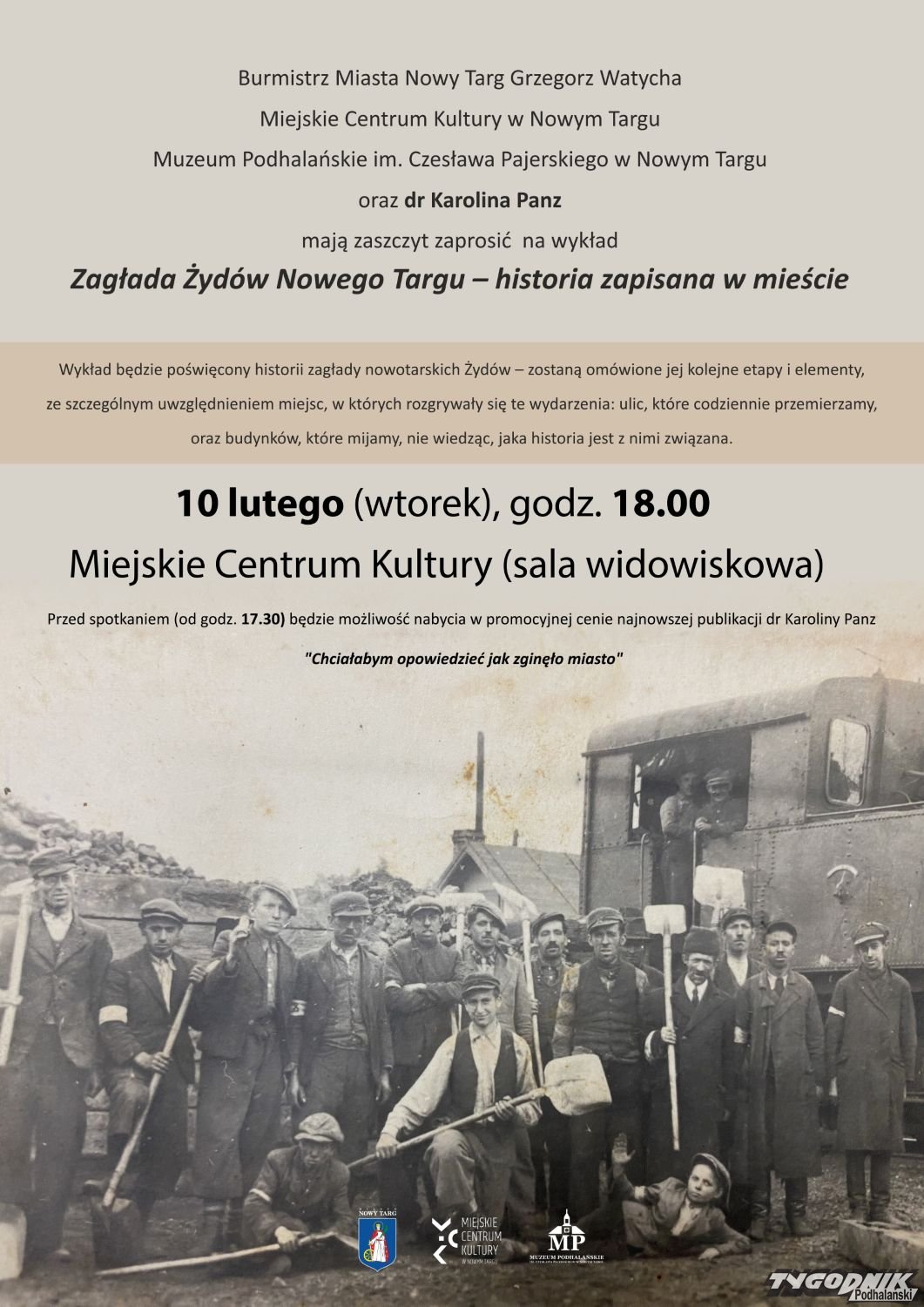 Burmistrz Miasta Nowy Targ Grzegorz Watycha, Miejskie Centrum Kultury w Nowym Targu, Muzeum Podhalańskie im. Czesława Pajerskiego w Nowym Targu oraz dr Karolina Panz mają zaszczyt zaprosić na wykład Zagłada Żydów Nowego Targu - historia zapisana w mieście.