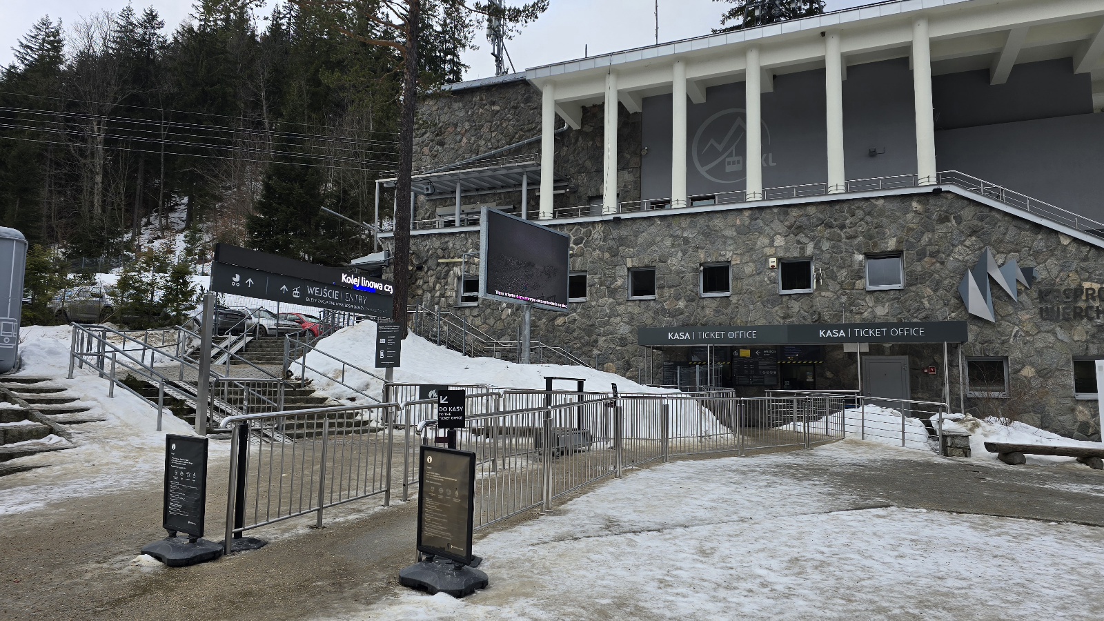 Przed kasami spotkaliśmy tylko dwie osoby. W Zakopanem mamy odwilż, +3 st. C., na Kasprowym -2. Przez szczyt przetaczają się chmury, wieje dość silny wiatr, a więc pogoda nie sprzyja wycieczkom. Taka aura utrzyma się przez najbliższe dni. Nie ma co liczyć na większe przejaśnienia. Wydaje się też, że w tym tygodniu ferii turystów jest nieco mniej niż przez pierwsze dwa tygodnie.
