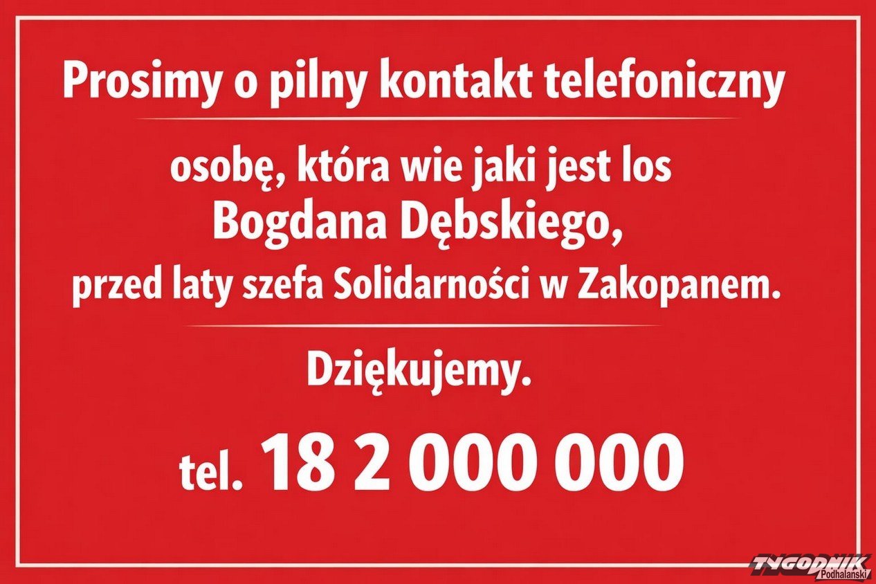 Zwracamy się z apelem do Czytelników o pomoc w ustaleniu losów Bogdana Dębskiego, przed laty szefa "Solidarności" w Zakopanem.