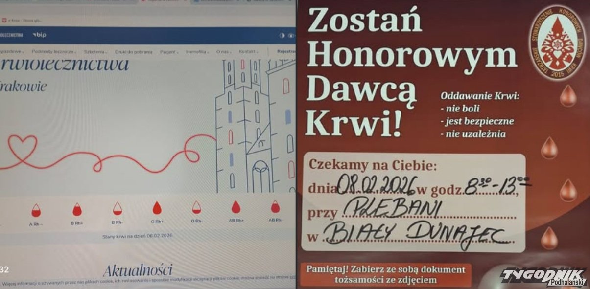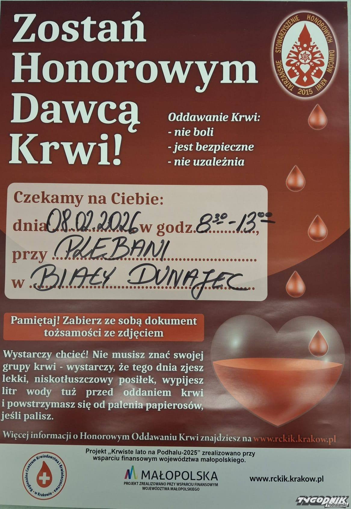 Regionalne Centrum Krwiodawstwa i Krwiolecznictwa w Krakowie Oddział Terenowy w Zakopanem zaprasza mieszkańców Podhala do udziału w wyjazdowej akcji krwiodawstwa, która odbędzie się w niedzielę, 8 lutego 2026 roku, w Białym Dunajcu.