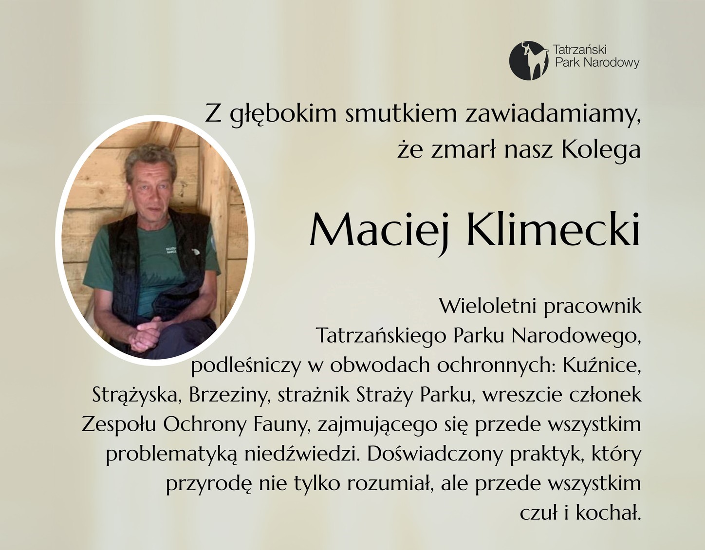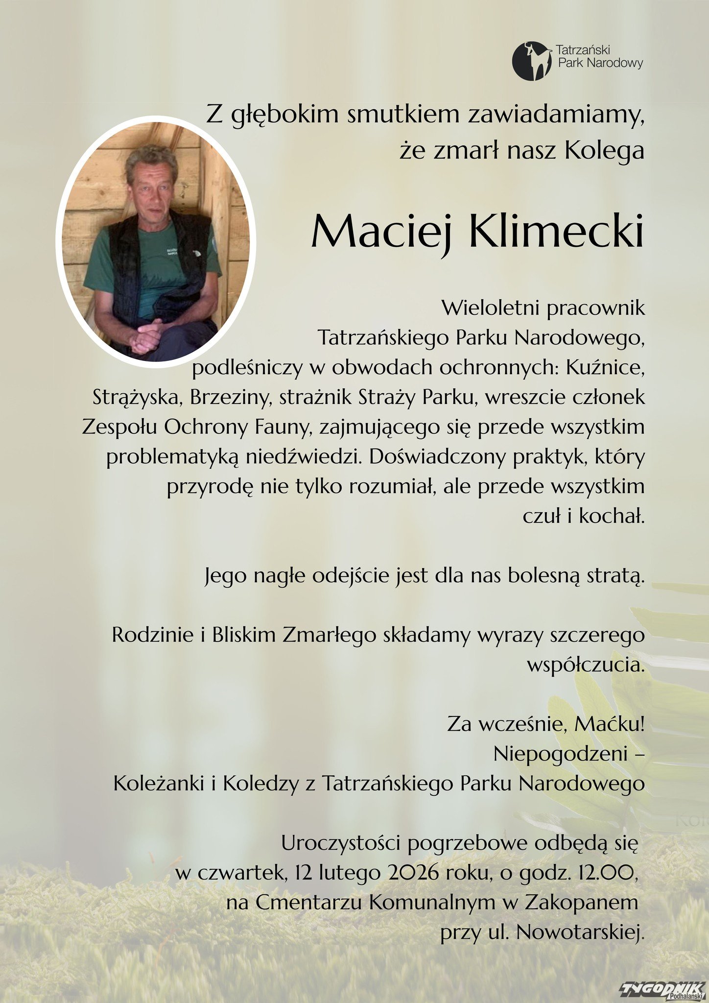 Maciej Klimecki zmarł 9 lutego w wieku 57 lat. Uroczystości pogrzebowe odbędą się 12 lutego o godz. 12 na cmentarzu przy ul. Nowotarskiej w Zakopanem.