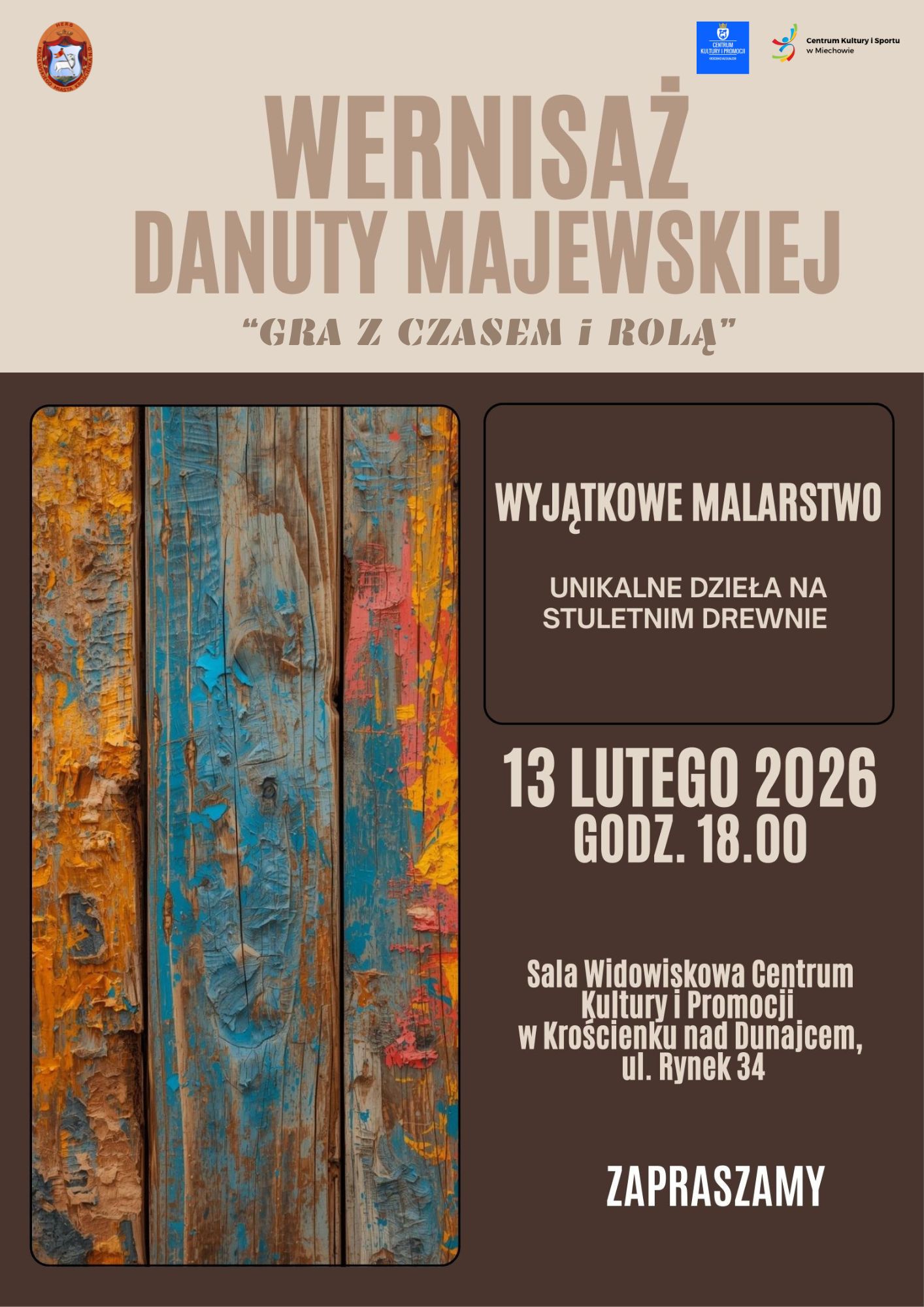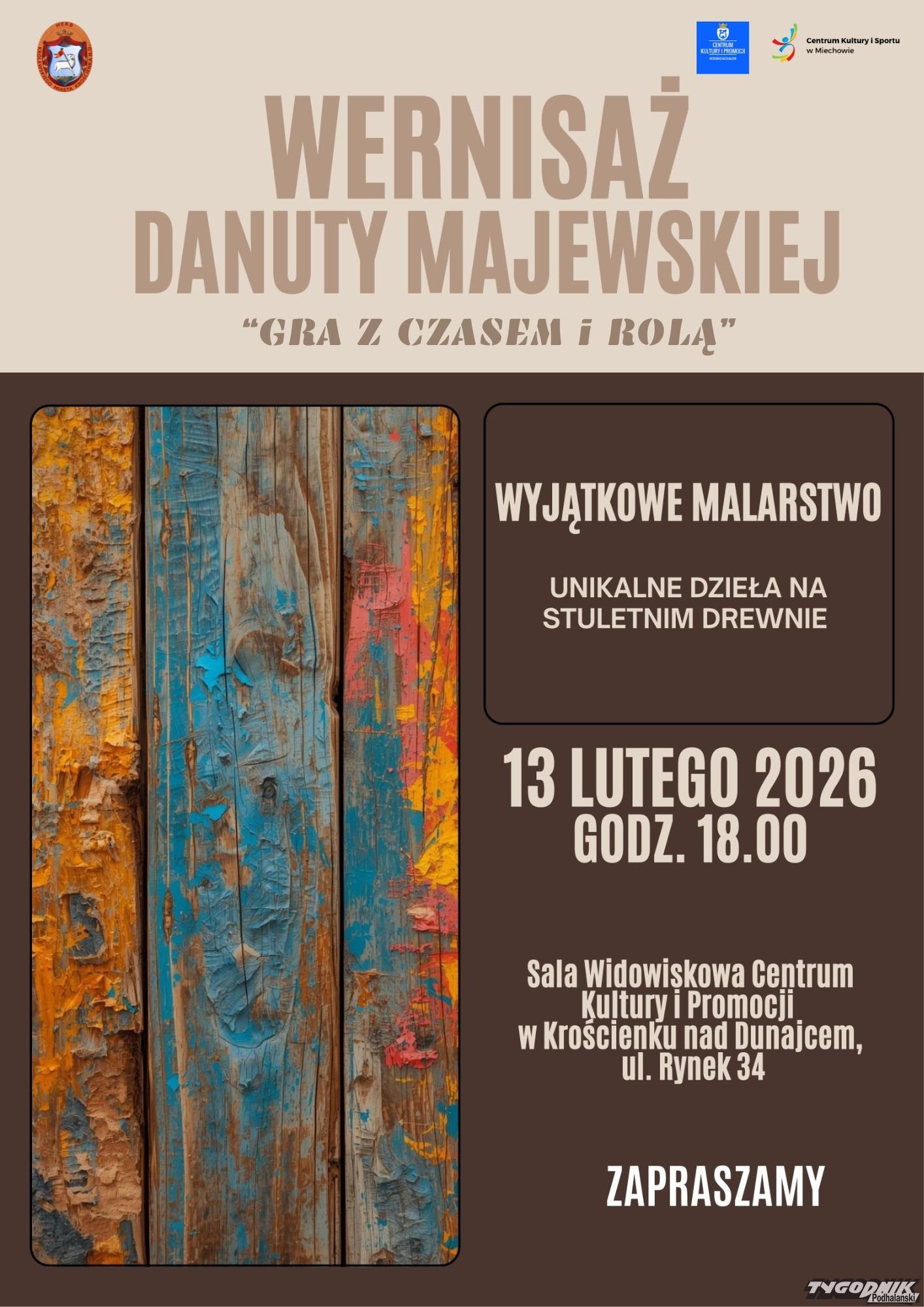 Wernisaż wystawy malarstwa Danuty Majewskiej pt. "Gra z czasem i rolą" odbędzie się 13 lutego w sali widowiskowej Centrum Kultury i Promocji w Krościenku nad Dunajcem.
