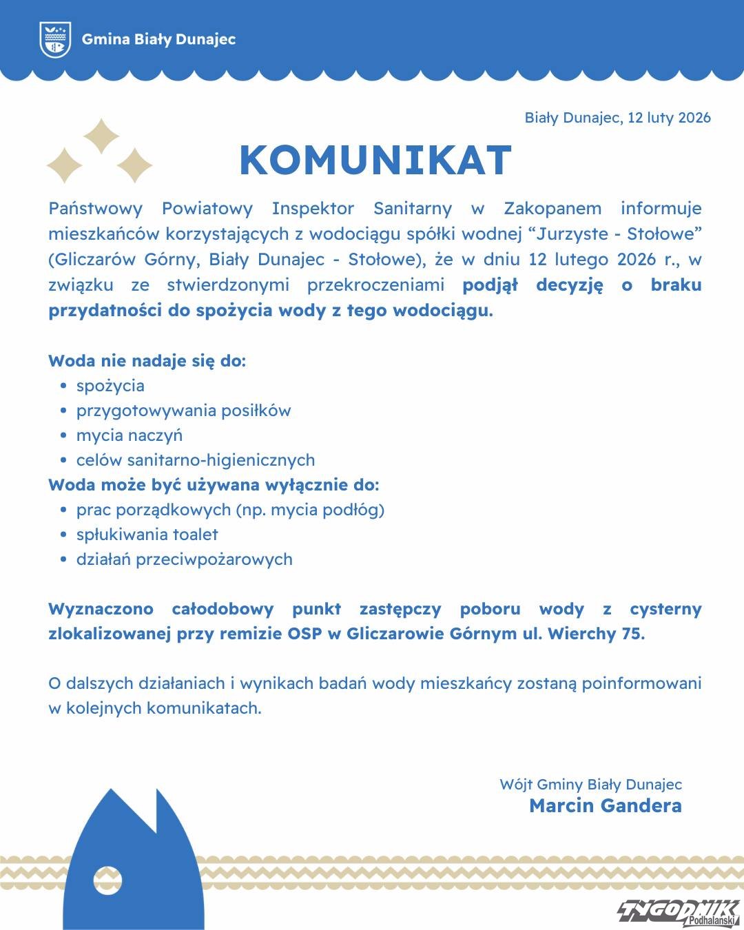 Państwowy Powiatowy Inspektor Sanitarny w Zakopanem wydał decyzję o braku przydatności do spożycia wody z wodociągu spółki wodnej "Jurzyste-Stołowe", zaopatrującego m.in. mieszkańców Gliczarowa Górnego i Białego Dunajca - Stołowego. Ograniczenia obowiązują od 12 lutego 2026 roku.