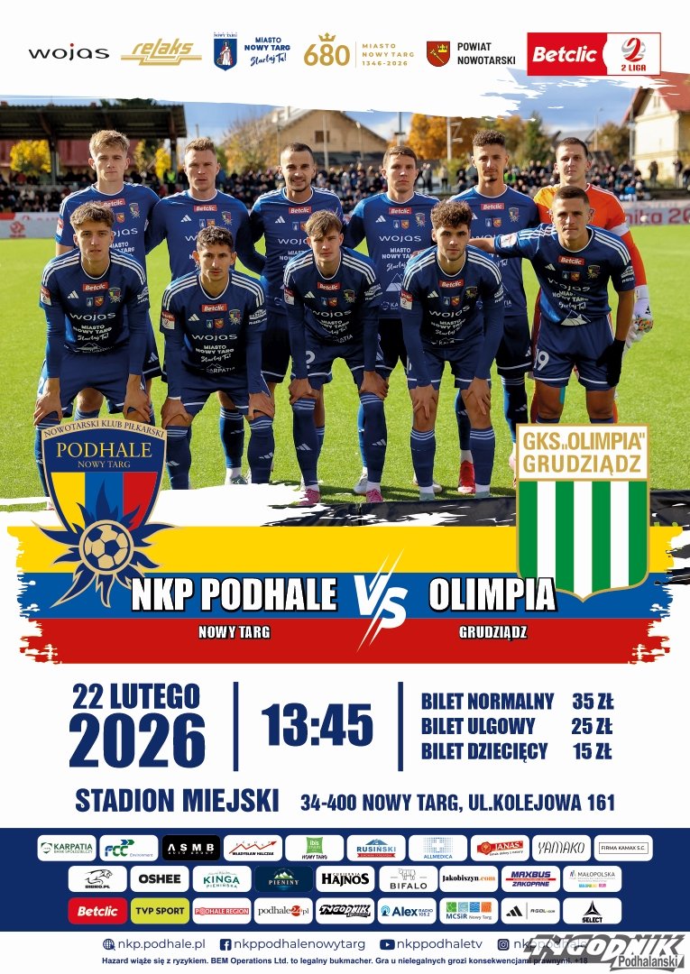 Piłkarze Podhale Nowy Targ zainaugurują rundę wiosenną rozgrywek II liga meczem przed własną publicznością. W sobotę 22 lutego w Nowym Targu zmierzą się z zespołem Olimpia Grudziądz.