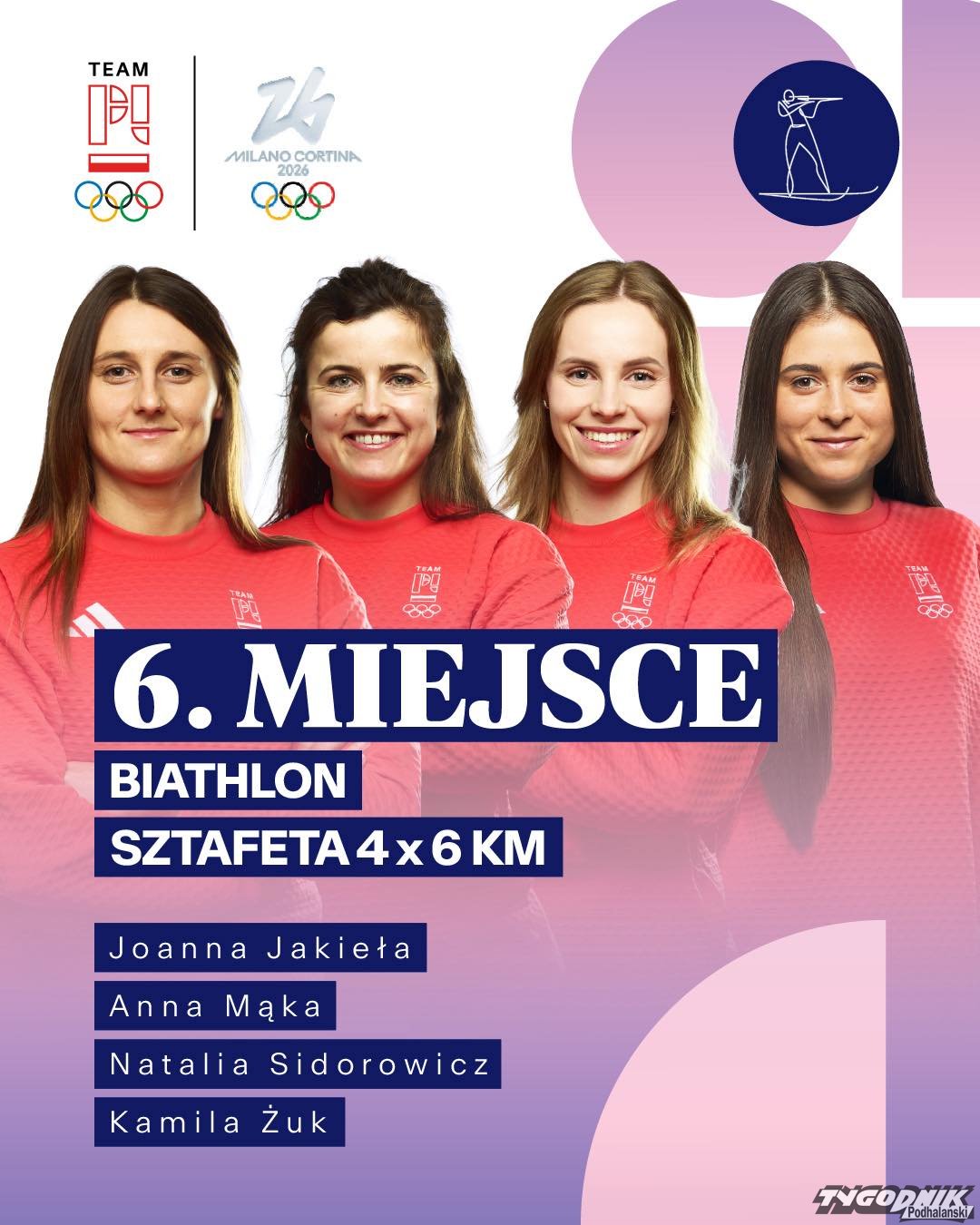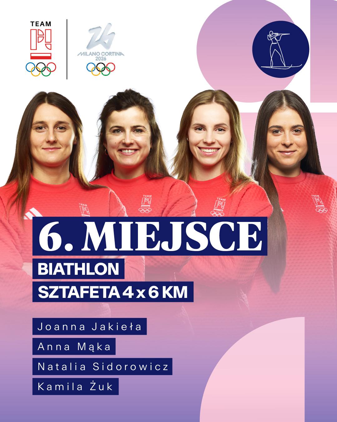Sztafeta pobiegła w składzie: Natalia Sidorowicz (Kościelisko), Joanna Jakieła (BKS WP Kościelisko), Anna Mąka (BKS WP Kościelisko) i Kamila Żuk. Na początku biegu sztafetowego 4*6 km startowała Anna Mąka. Trzy razy nie trafiła do tarczy. Zajmowaliśmy 16. miejsce. Kamila Żuk nie pudłowała i wyprowadziła Polki na dziewiąte miejsce. Po starcie Joanny Jakieły zajmowaliśmy siódme miejsce. Natalia Sidorowicz wyprowadziła naszą sztafetę na szóste miejsce. Brawo! To najlepszy wynik naszej damskiej sztafety biathlonowej na Igrzyskach w historii. Zwyciężyła Francja przed Szwecją i Norwegią.