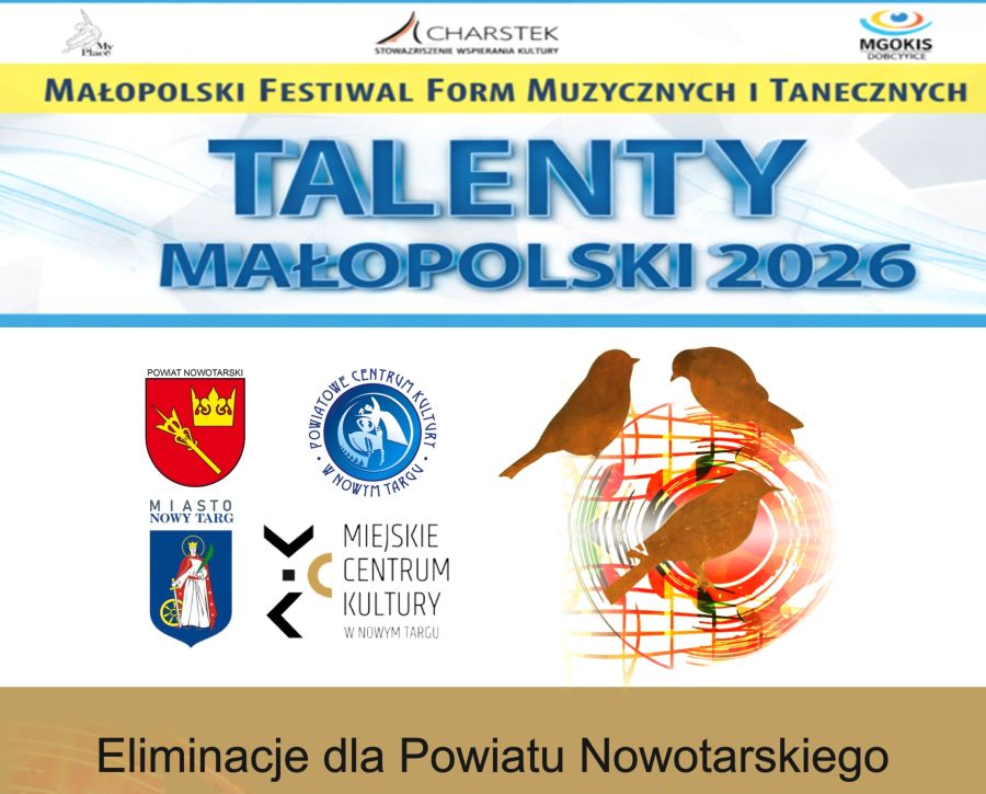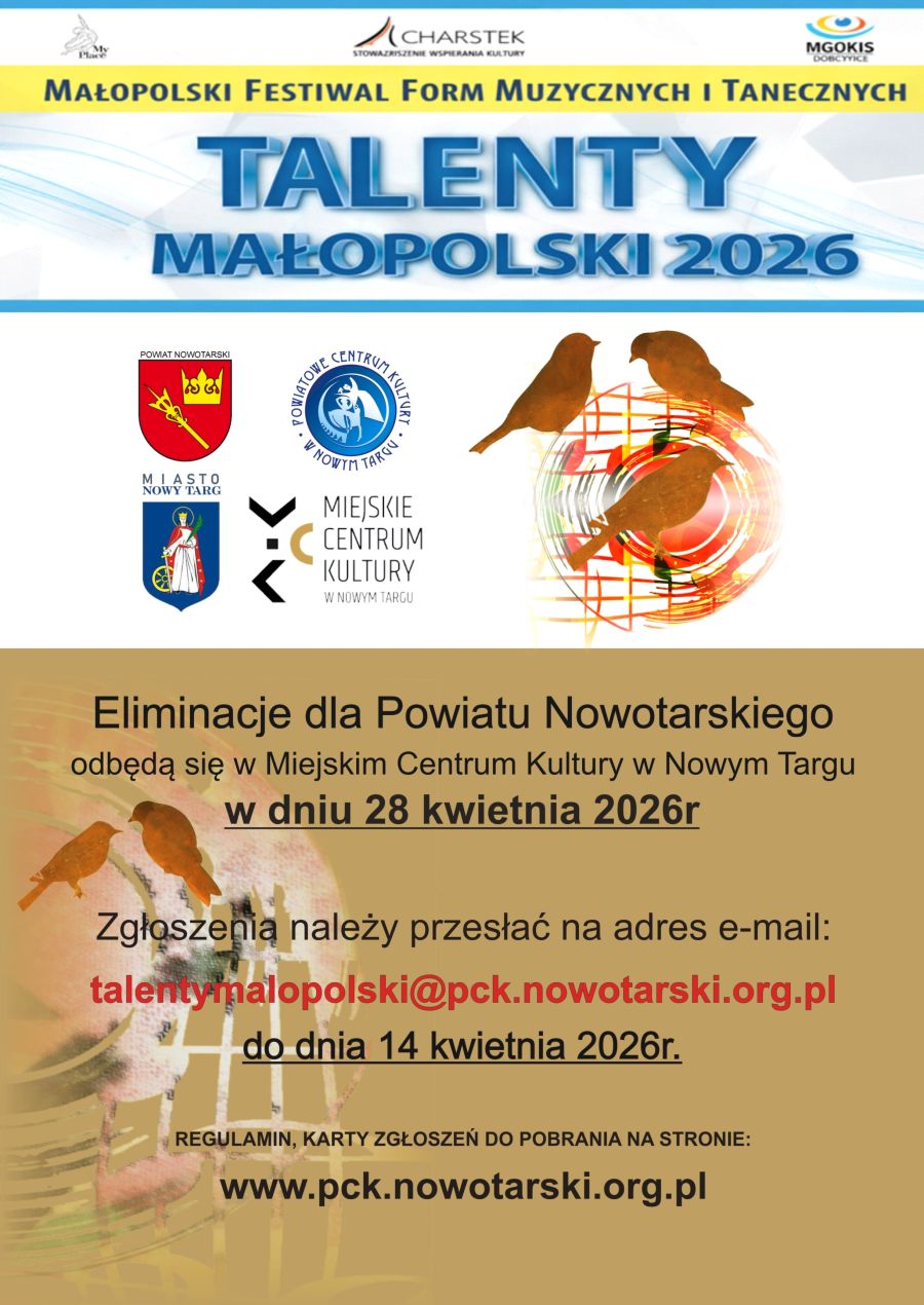 Eliminacje dla powiatu nowotarskiego odbędą się we wtorek 28.04 w Miejskim Centrum Kultury w Nowym Targu. Zgłoszenia należy przesłać do 14.04 na adres: talentymalopolski@pck.nowotarski.org.pl.