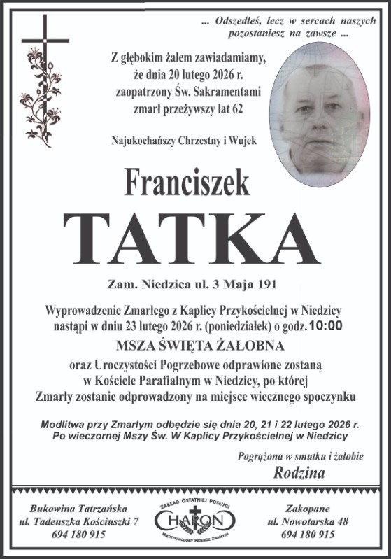 2026-02-20 17:18 Ewa Garbacz nową wiceprzewodniczącą Rady Miasta 1 2026-02-20 17:06 Przed nami jedna z ostatnich tak mroźnych nocy? Za kilka dni +10 st. C! 2026-02-20 17:02 Tuż przed nadzwyczajną sesją Rady Miasta Nowy Targ rozmawialiśmy z Janem Sięką, którego odwołania domaga się 13 radnych 2026-02-20 17:00 Noże, kij bejsbolowy i podejrzane substancje w bagażniku. Słowak wpadł w ręce strażników granicznych 2026-02-20 16:15 Ognisko zjadliwej ptasiej grypy w Waksmundzie 2026-02-20 16:01 Kiedy wybrać ulotkę składaną zamiast zwykłej? 2026-02-20 16:00 Kontrola z narkotykami 2026-02-20 15:50 Zapowiada się udany weekend. Turyści już są, korki też 2026-02-20 15:42 Osteopatia jako zawód przyszłości - czy rośnie zapotrzebowanie na specjalistów? 2026-02-20 15:00 Kapitalne dziś warunki narciarskie w Jurgowie! 1 2026-02-20 14:00 Jeleń z porożem zaplątanym w sznurki spaceruje po Zakopanem 9 2026-02-20 13:00 Iwona Januszyk: Zrobiłam wszystko. Dramatyczne wyznanie po sprincie na igrzyskach 6 2026-02-20 12:01 Jaki krem do twarzy wybrać na różne pory roku? 2026-02-20 12:00 Co robić w weekend w Zakopanem? 2026-02-20 11:32 Artfoll - Lider Wielkoformatowych Realizacji Oklejania: Najlepsza jakość, Efekt Wow i Eksperci Bez Granic 2026-02-20 11:30 Cathy i Heathcliff. Skomplikowana miłość. Mamy dla Was bilety 2026-02-20 11:00 Piękne krajobrazy w Dolinie Stążyskiej. Wyżej nie wychodzimy! (WIDEO) 2026-02-20 10:00 Nowa droga a studzienki się pozapadały 6 2026-02-20 09:00 Zimowe ferie pełne atrakcji w Szkole Podstawowej nr 7 na Cyrhli 2026-02-20 08:00 Przenikanie w Teatrze Witkacego. Międzypokoleniowy dialog sztuki w Zakopanem 1 2026-02-19 21:08 W Tatrach znowu lawinowa trójka. Jest bardzo niebezpiecznie 2026-02-19 21:01 Mimo zaangażowania bardzo wielu osób nadal nie natrafiono na ślad poszukiwanego turysty 2 2026-02-19 20:00 Jeden ryś, dwa rysie, trzy rysie ... (WIDEO) 2026-02-19 19:23 Bajkowe krajobrazy wieczorową porą w Zakopanem (WIDEO) 7 2026-02-19 19:00 Rabczański samorząd przegrał w sądzie z wojewodą 3 2026-02-19 18:30 Wsparcie dla Grupy Podhalańskiej GOPR od gorczańskiego parku 2026-02-19 18:25 Rusza nabór do nagrody Romana Reinfussa 2026-02-19 18:00 Wilki w Rabce 4 2026-02-19 17:00 Ponad pół miliarda złotych na Bachleda Termy Kasprowy. Bank o szczegółach finansowania 11 2026-02-19 16:50 Duży pies bez opieki przy trasach biegowych na Polanie Chotarz. Gmina apeluje do właściciela 2026-02-19 16:00 Najwyżej położony luksus w Polsce. Gigantyczna inwestycja na Butorowym Wierchu (WIDEO, ZDJĘCIE) 2 2026-02-19 15:00 Doszło do bójki, a poszło o dziewczynę (WIDEO) 1 2026-02-19 14:30 Seniorzy z Poronina zadbają o formę. Ruszają warsztaty prozdrowotne 2026-02-19 14:02 Nie poleciała do Bristolu. Z lotniska trafiła prosto do aresztu 2026-02-19 13:29 Jest dofinansowanie na nowe lądowisko dla śmigłowców przy szpitalu w Nowym Targu 8 2026-02-19 12:23 Zaginął Andrzej Dubiel. Policja prowadzi poszukiwania w Tatrach 2 2026-02-19 12:00 Piękne widoki z Nosala o poranku (WIDEO) 2026-02-19 11:29 XXVI Parada Gazdowska w Gminie Biały Dunajec 2026-02-19 11:00 Poczta w Poroninie z krótszymi godzinami otwarcia. Zmiany mają charakter tymczasowy 2 2026-02-19 10:00 Trwają poszukiwania zaginionego 30-latka 2026-02-19 09:00 Krew, która ratuje życie. 13 litrów zebranych podczas akcji w Maruszynie 2026-02-19 08:49 Plama oleju na DK28 w Makowie Podhalańskim. Strażacy prowadzą działania, są utrudnienia w ruchu 2026-02-19 08:00 Energetyczne eldorado 2026-02-18 22:00 Losowane sentencje, fraszki i poezja NIESKONCZONE 2026-02-18 21:00 W czwartek na Igrzyskach startują nasi skialpiniści 4 2026-02-18 20:00 Oświata, sport i inwestycje. Szerokie plany Zakopanego dla szkół 5 2026-02-18 19:00 Całkiem sporo turystów na Krupówkach i pod Gubałówką (WIDEO) 2 2026-02-18 18:44 Poszukiwania turysty w Tatrach. W akcji 22 ratowników i śmigłowiec TOPR 2026-02-18 18:00 Policjanci w zerówce 2026-02-18 17:30 Światowy Dzień Kota - wykład w najbliższy piątek 5