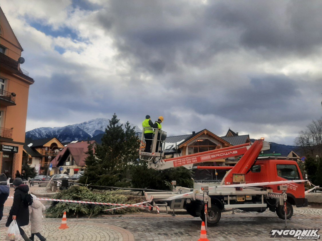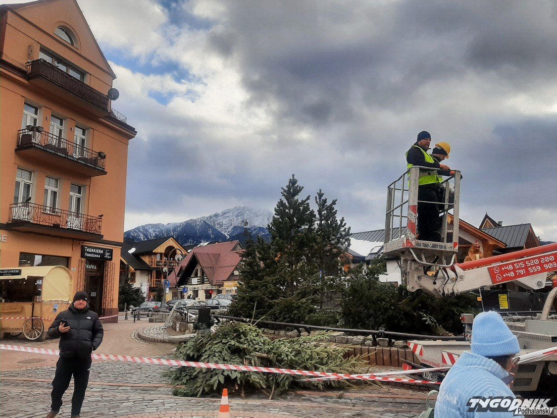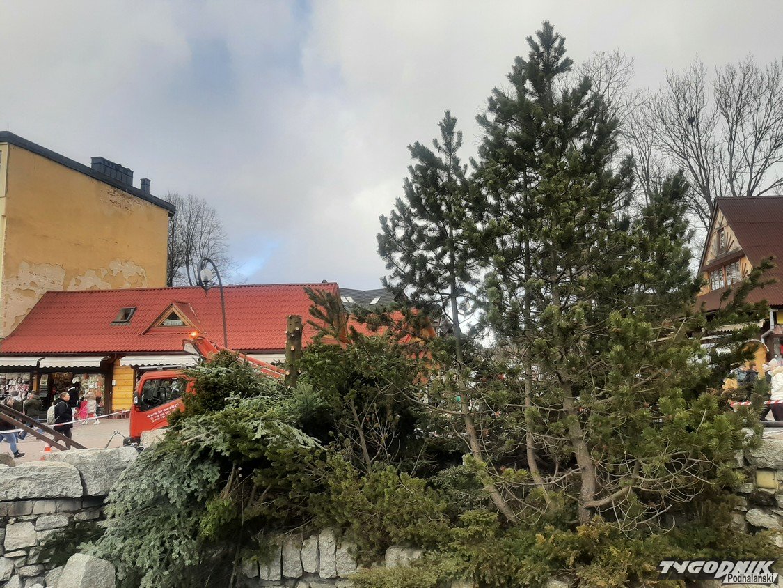 Ekipa służb miejskich rozebrała choinkę przy oczku wodnym na Krupówkach, drzewko pocięto na miejscu.