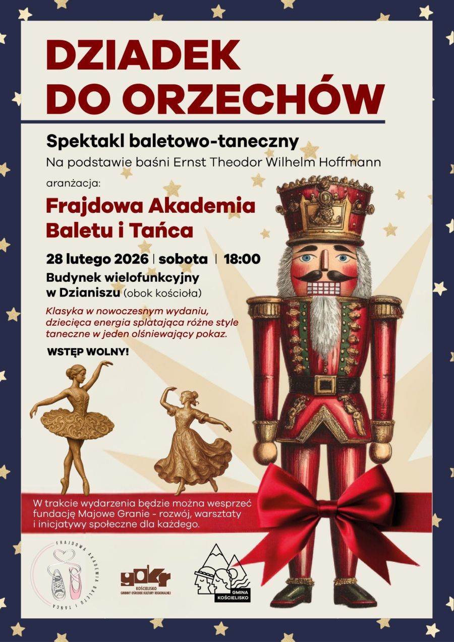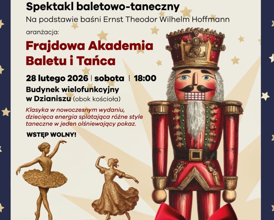 W Budynku wielofunkcyjnym w Dzianiszu (obok kościoła) obejrzymy "Dziadka do orzechów" na podstawie baśni Ernsta Theodora Wilhelma Hoffmanna. Spektakl przygotowany przez Akademię, która kontynuuje autorski program familijnego teatru tańca łączącego klasykę baletu, taniec współczesny, nowoczesny oraz choreografię w lekkim, innowacyjnym wydaniu.
