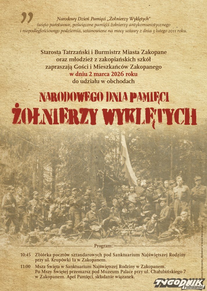 Starosta Tatrzański i Burmistrz Miasta Zakopane oraz młodzież z zakopiańskich szkół zapraszają gości i mieszkańców Zakopanego w dniu 2 marca 2026 r. do udziału w obchodach Narodowego Dnia Pamięci Żołnierzy Wyklętych.