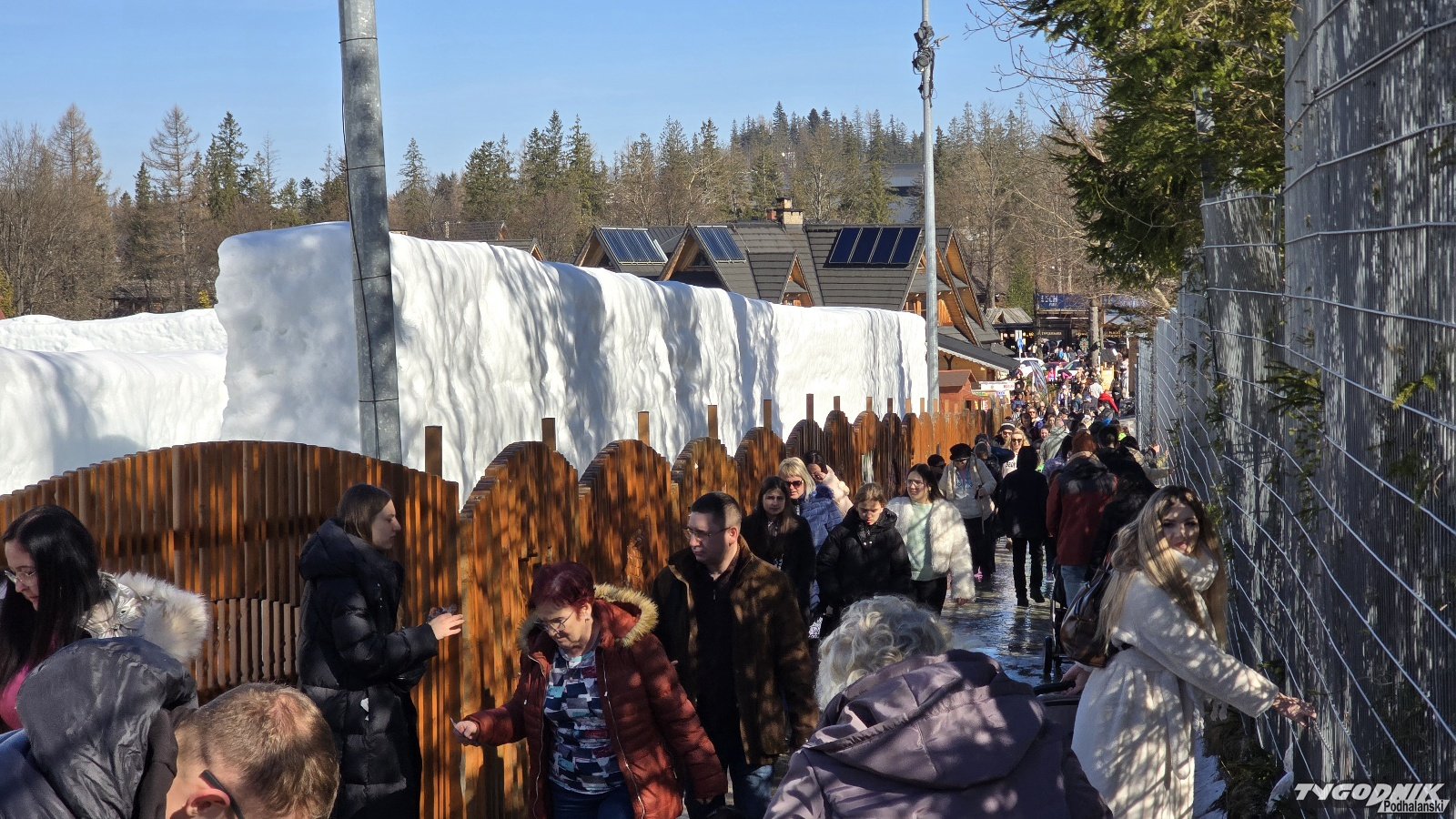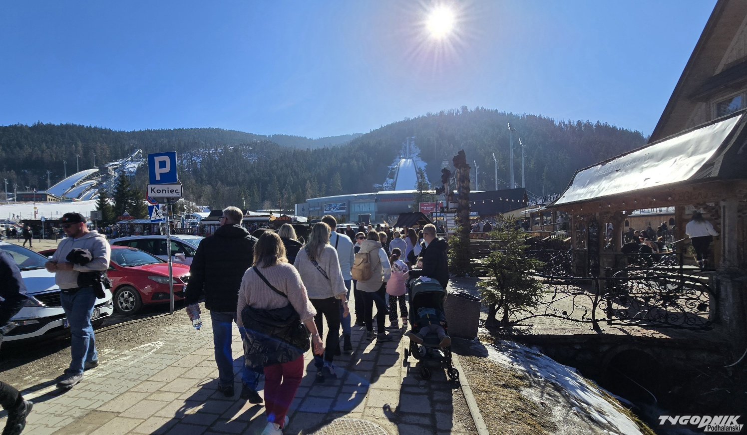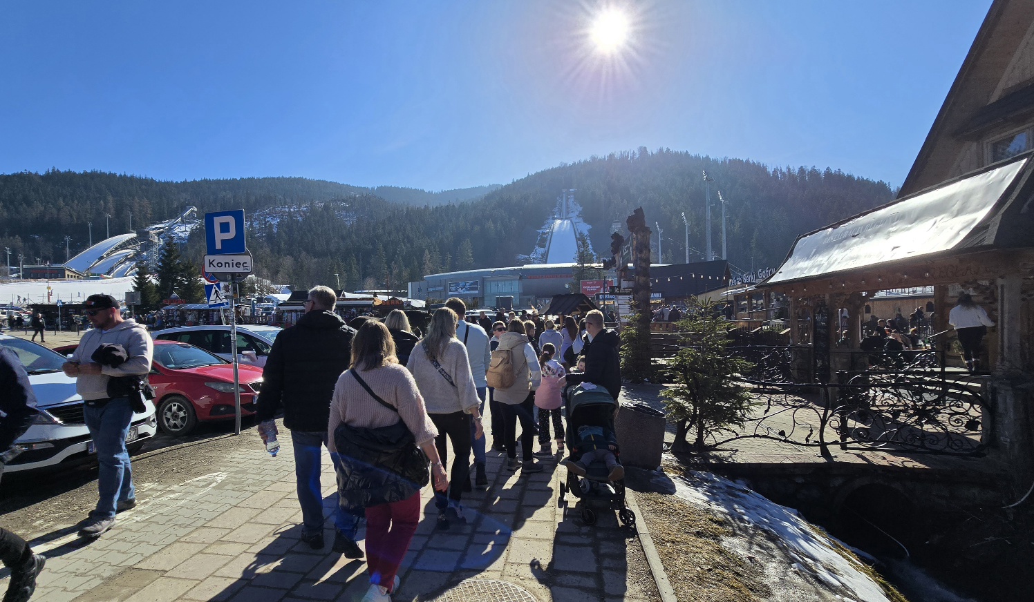 Wiele osób wybrało się dziś w okolice Wielkiej Krokwi. Wyciągiem krzesełkowym można wyjechać na górę skoczni i podziwiać niezapomniany widok na Zakopane. Jest tu też w okolicy mały wyciąg narciarski, a także śnieżny labirynt, który niezmiennie przyciąga tłumy chętnych. Dziś mamy 10 st. C., przepiękną pogodę i do tego weekend, a więc turystów nie brakuje.