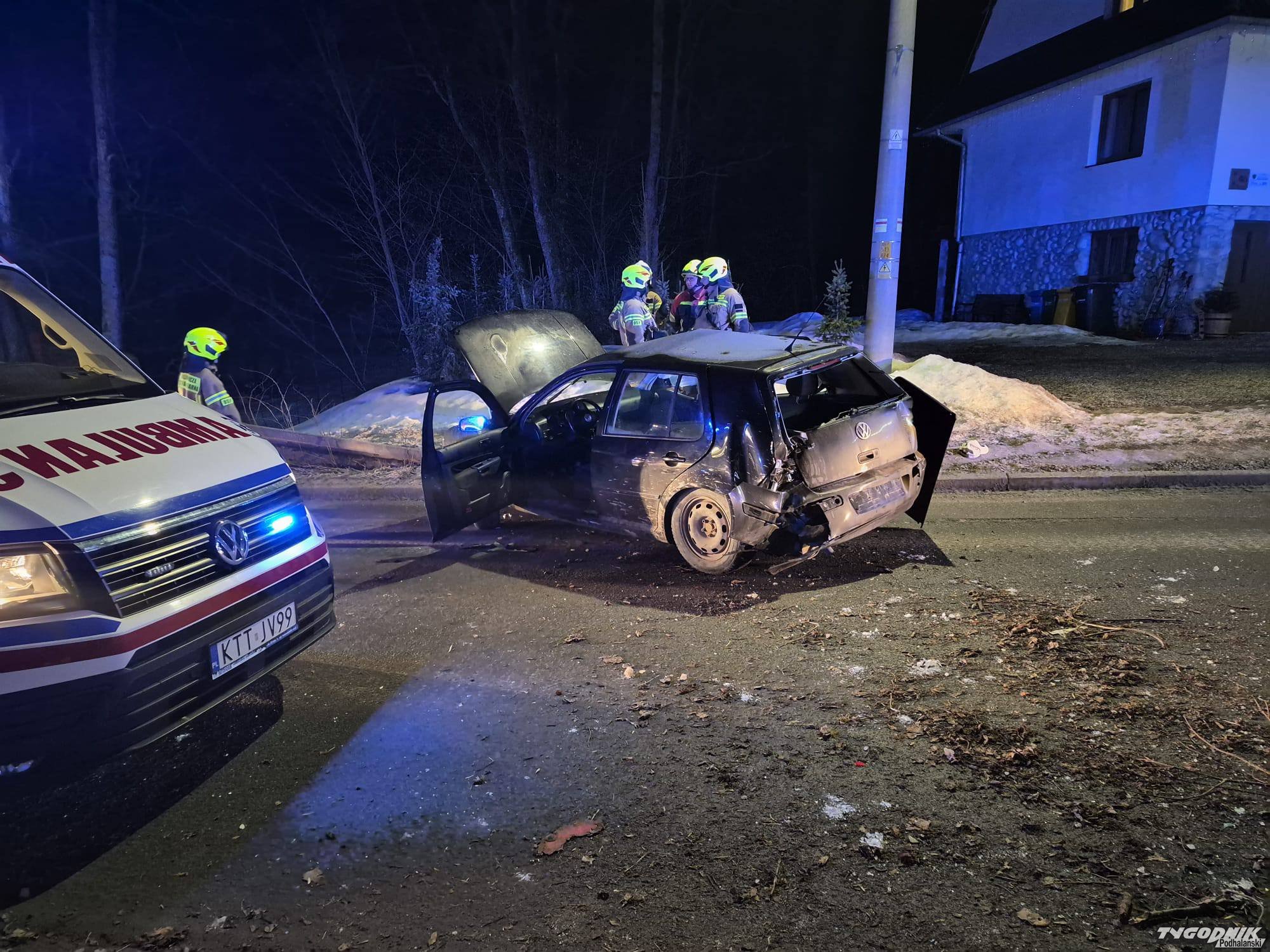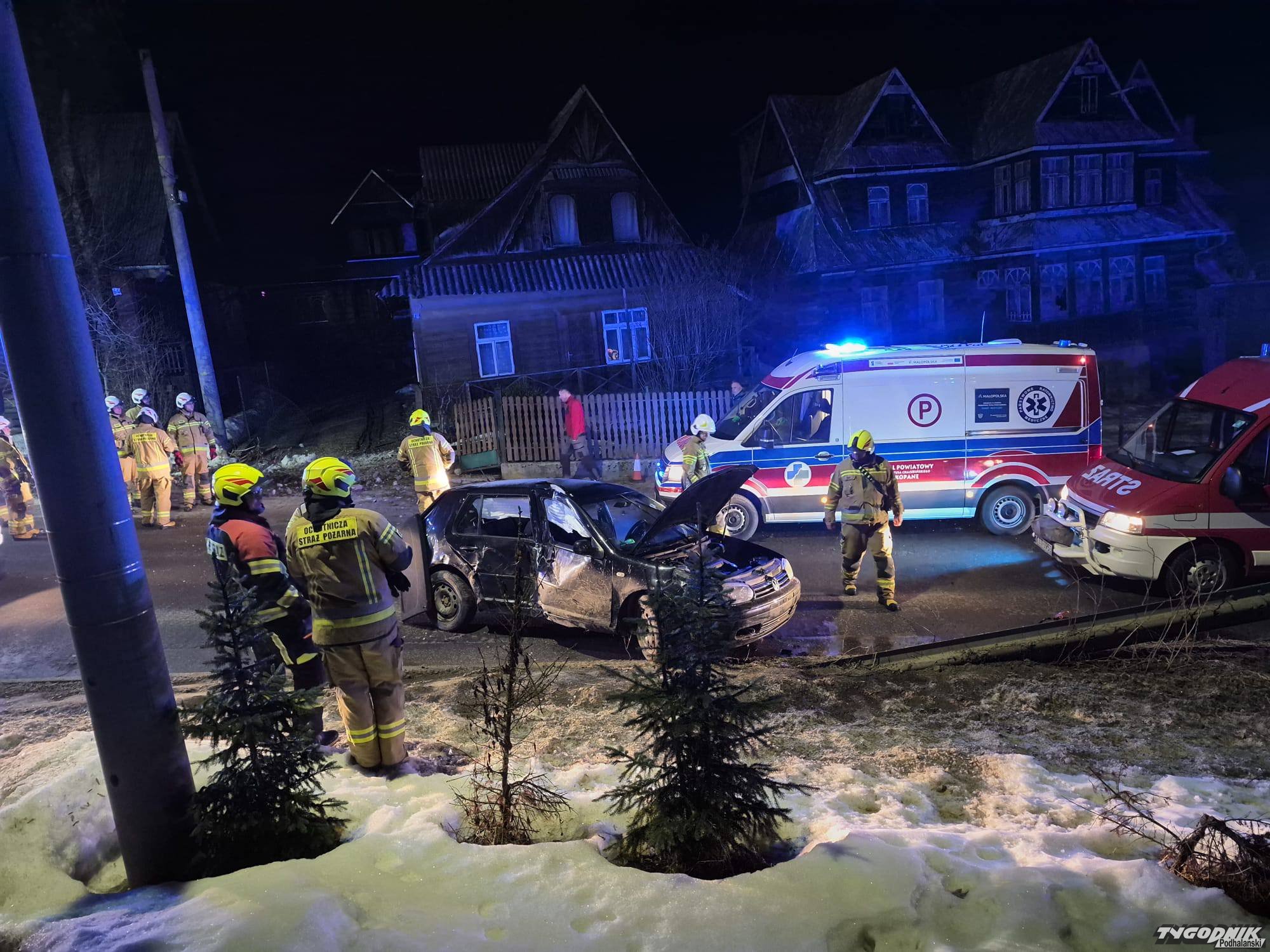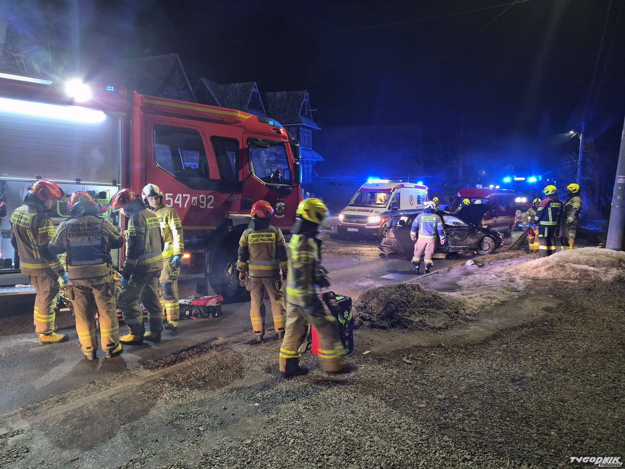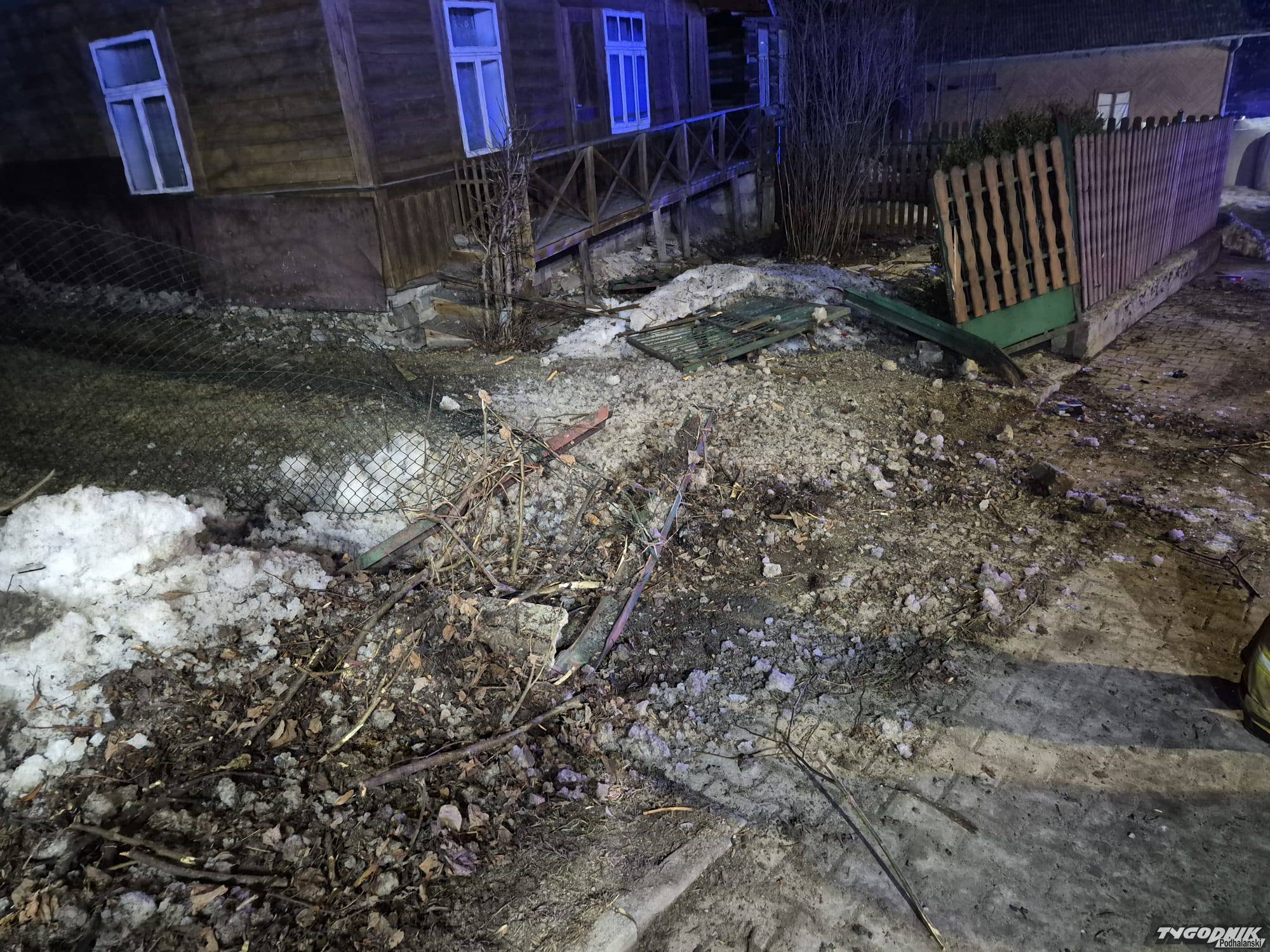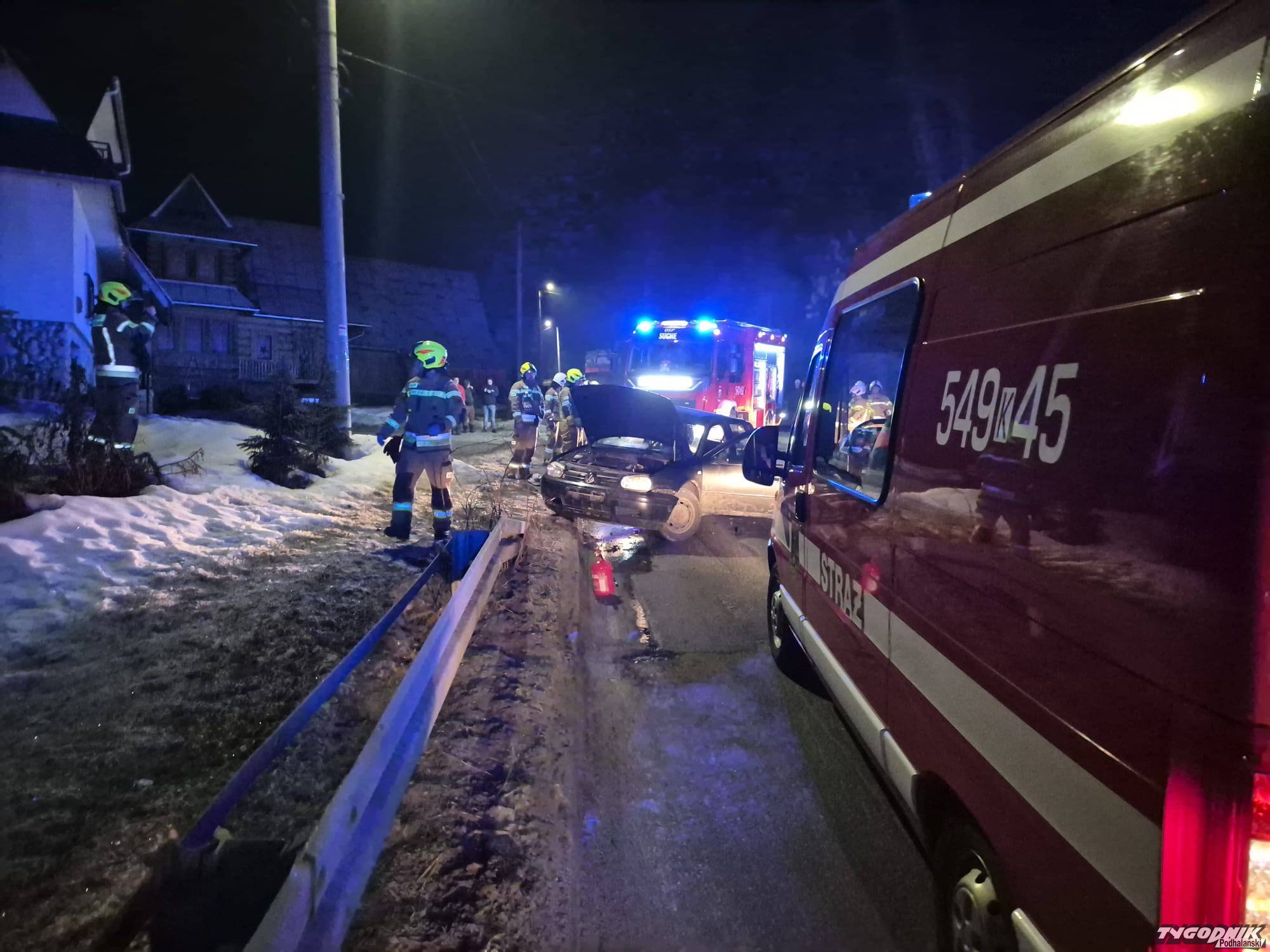 Nocny wypadek w Suchem. Samochód uderzył w ogrodzenie, dwie osoby trafiły do szpitala