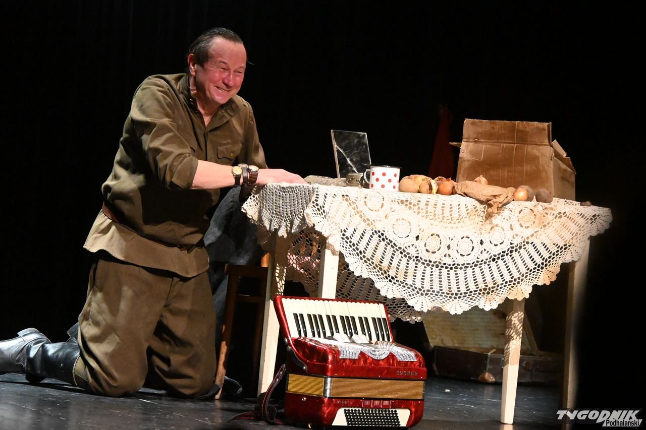 Monodram podzielony był na kilka scen, które świetnie zagrał znany i ceniony podhalański aktor. Bohater, w którego się wcielił wychował się w systemie totalitarnym i stąd postrzega Polskę jako kraj pełen sprzeczności. Na początku widzi wszystko w sposób groteskowy i komiczny, ale doświadczenia wojenne zmieniają jego spojrzenie.