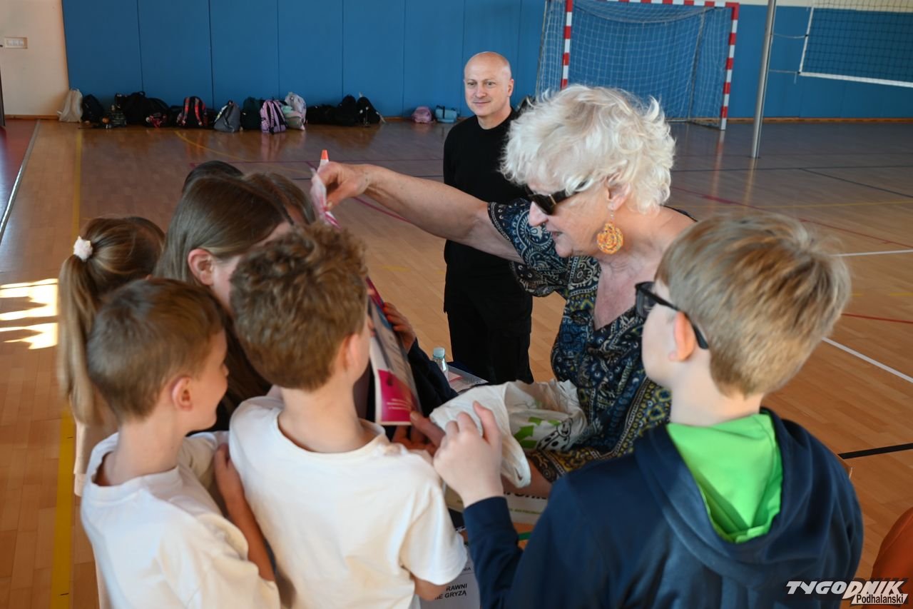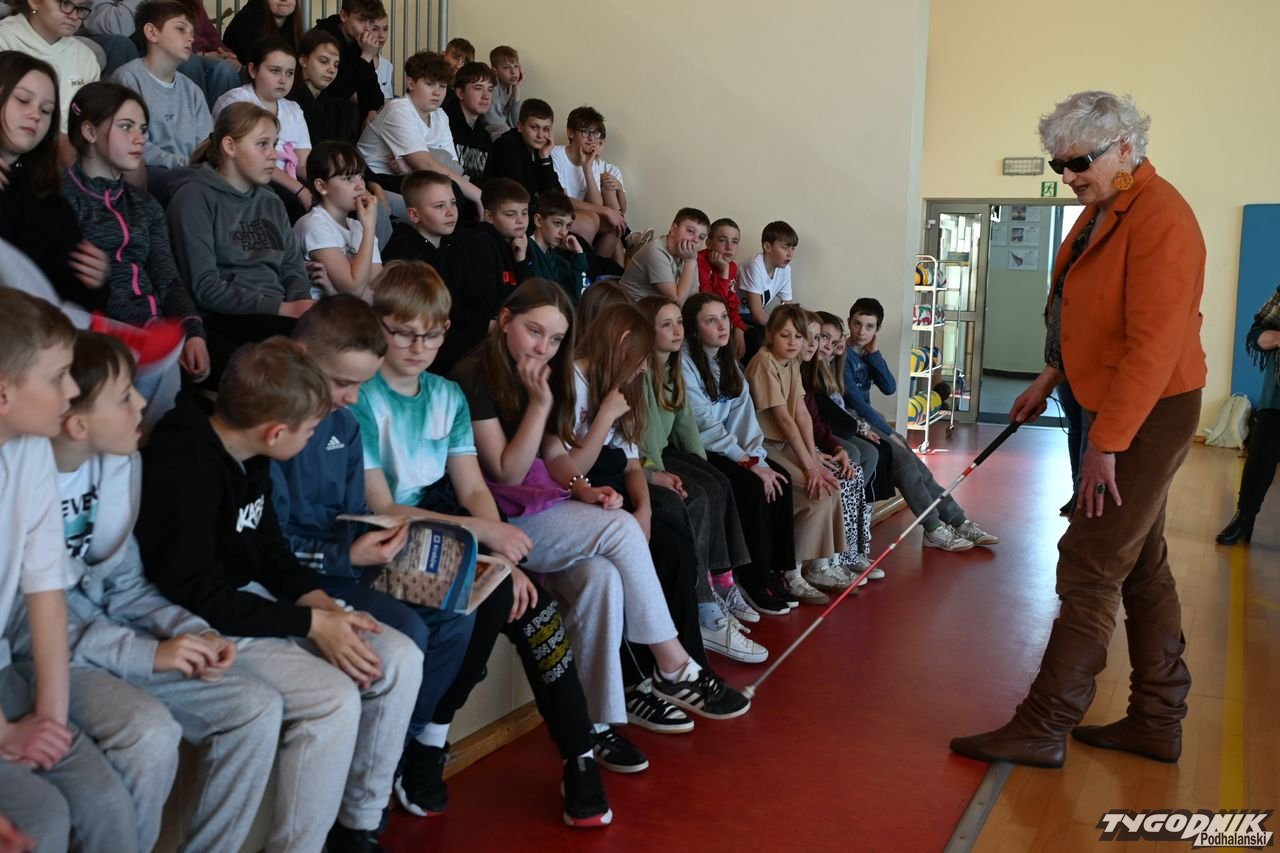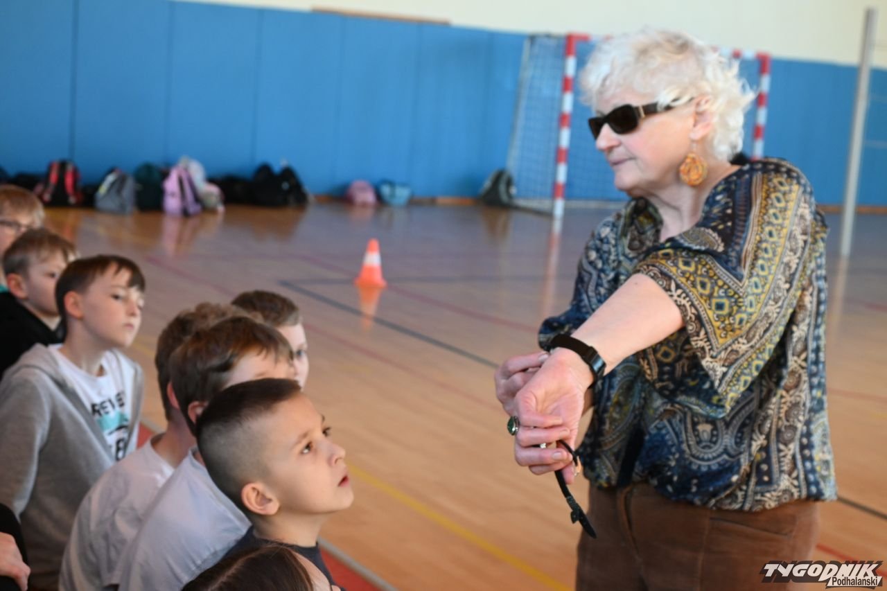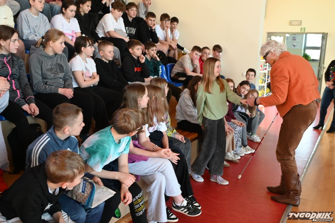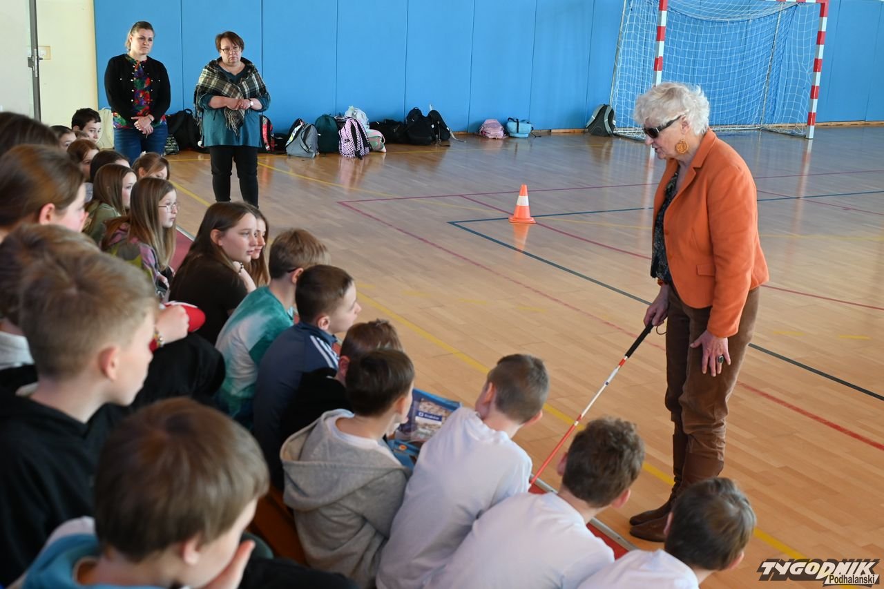 Dzięki spotkaniu z Barbarą Sowińską uczniowie mogli się dowiedzieć, jak odpowiednio pomóc osobom niewidomym, ale także poczuć się przez chwilę jak one, np. ochotnicy z zamkniętymi oczami rozpoznawali odpowiedni owoc czy warzywo. Społeczność szkolna dostała w prezencie od pani Basi książkę zapisaną w alfabecie Braillea.