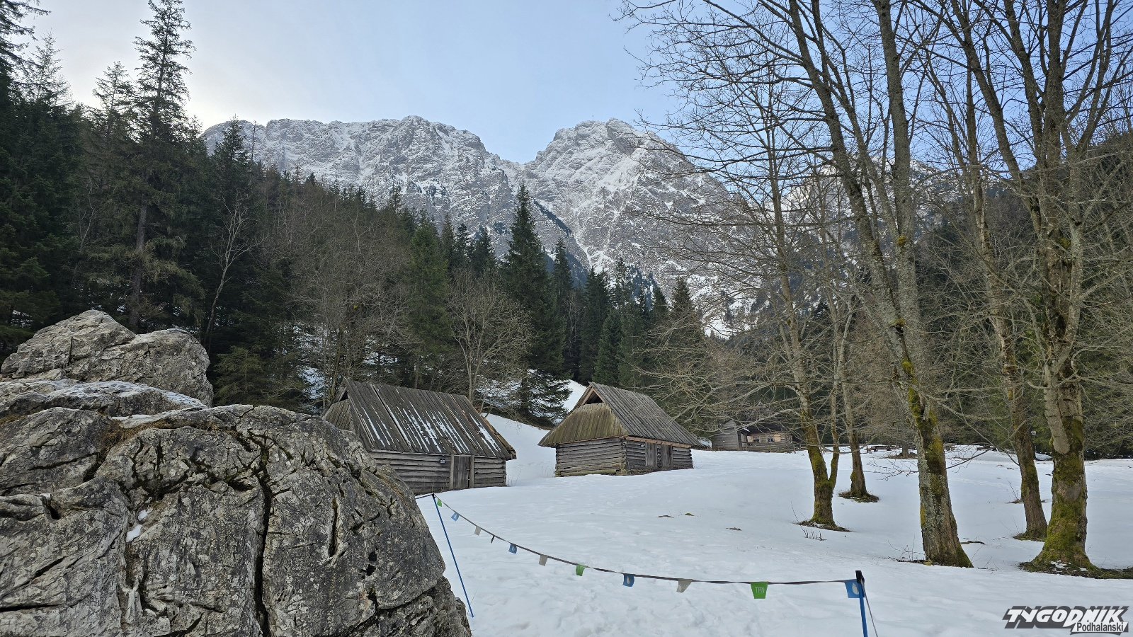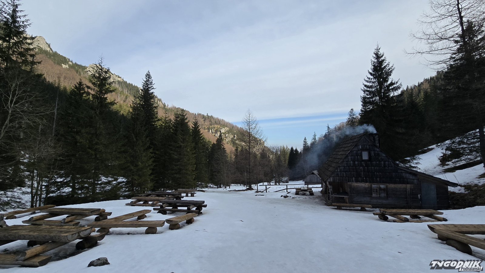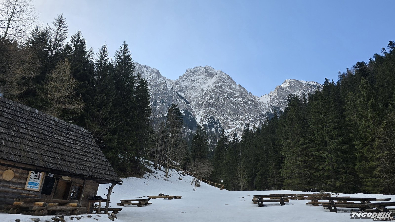 Od rana słońce przebija się przez chmury. To będzie kolejny ciepły i dość ładny dzień. Z Polany Strążyskiej roztacza się jak zwykle przepiękny widok na Giewont. Śpiący Rycerz jest tu na wyciągnięcie ręki. Po zakończeniu ferii w Tatrach zdecydowanie mniej turystów. Ci w większej liczbie przyjadą pewnie na weekend. Na szlaku w Strążyskiej rano bardzo ślisko. Konieczne jest używanie raczków.