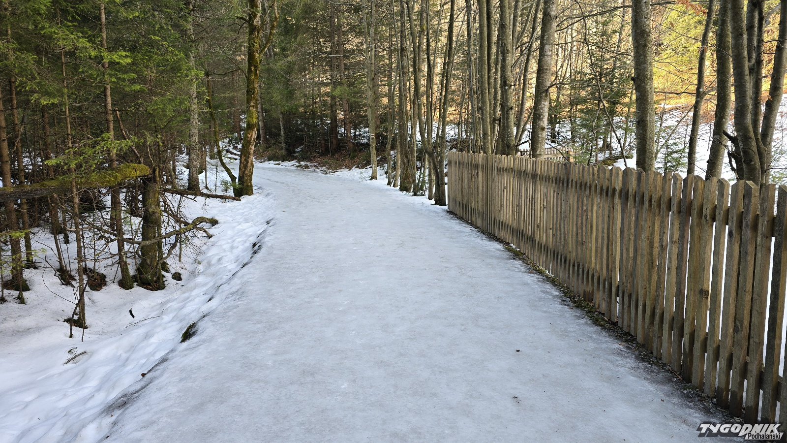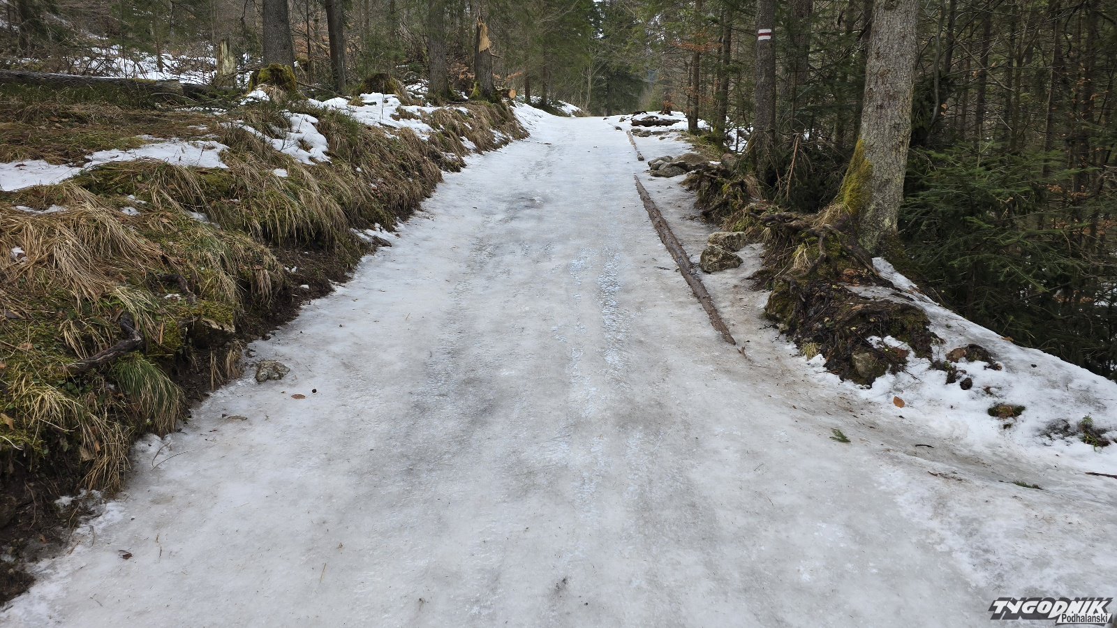 Poruszanie się nawet pod Drodze pod Reglami czy Dolinie Strążyskiej wymaga założenia raczków. Miejscami na szlaku zalega lód, najgorzej jest rano, gdy trzyma jeszcze nocny przymrozek. Największa zalodzenia występują właśnie na tych najniżej położonych trasach. Taka sytuacja na razie się nie zmieni. Co prawda w najbliższych dniach temperatura maksymalna będzie dochodzić do 10 st. C., ale nocą może chwytać lekki mróz.