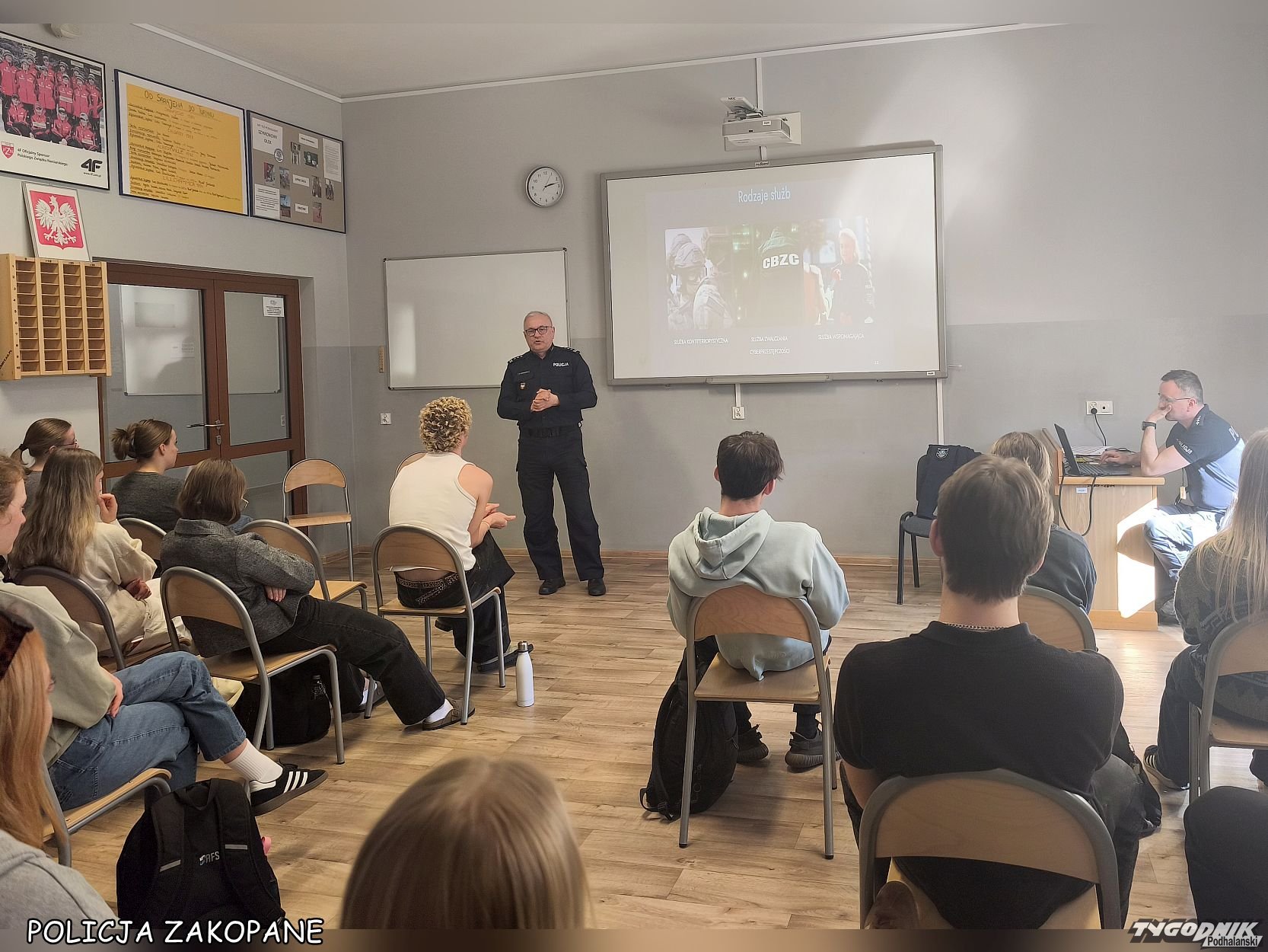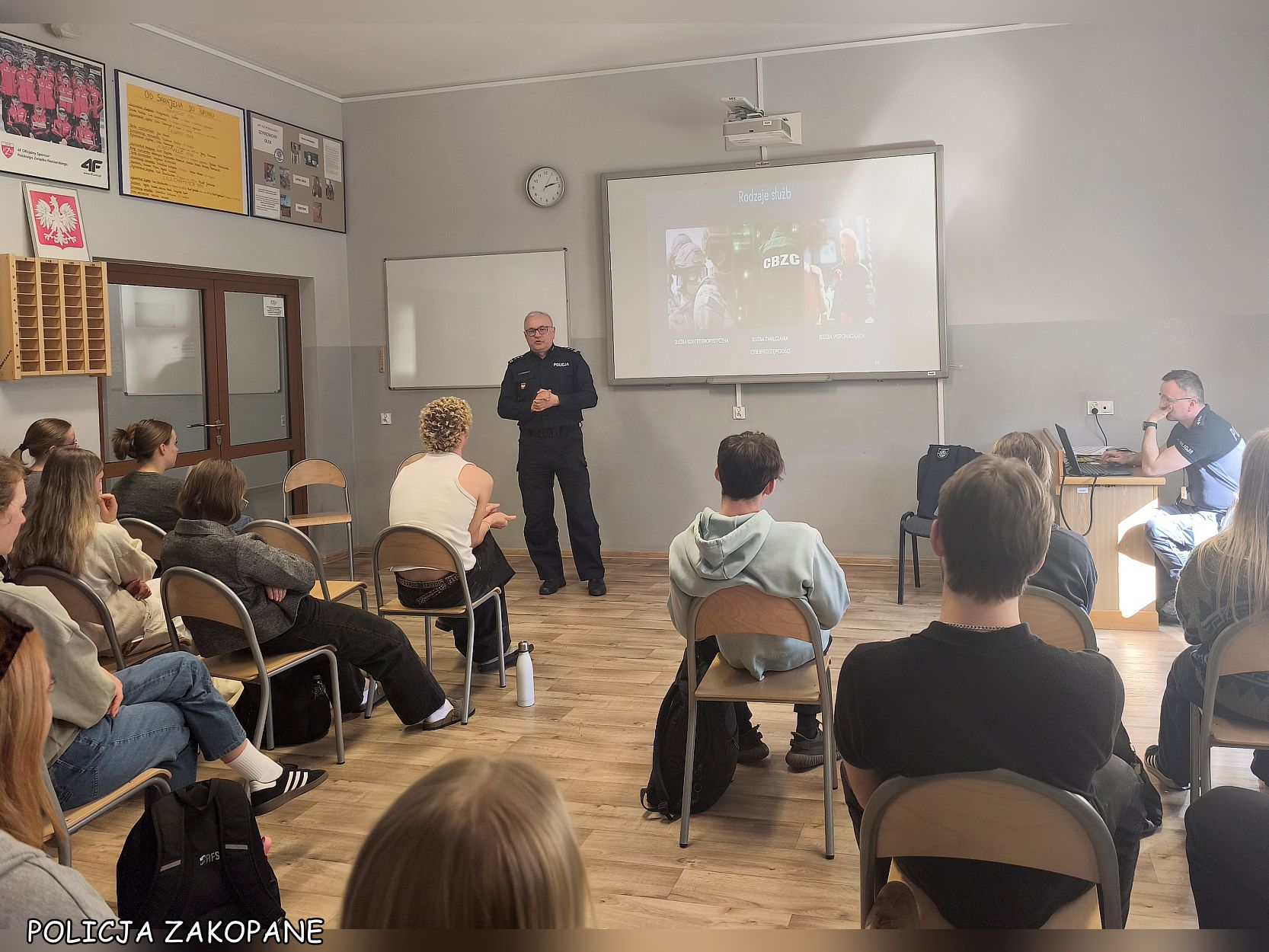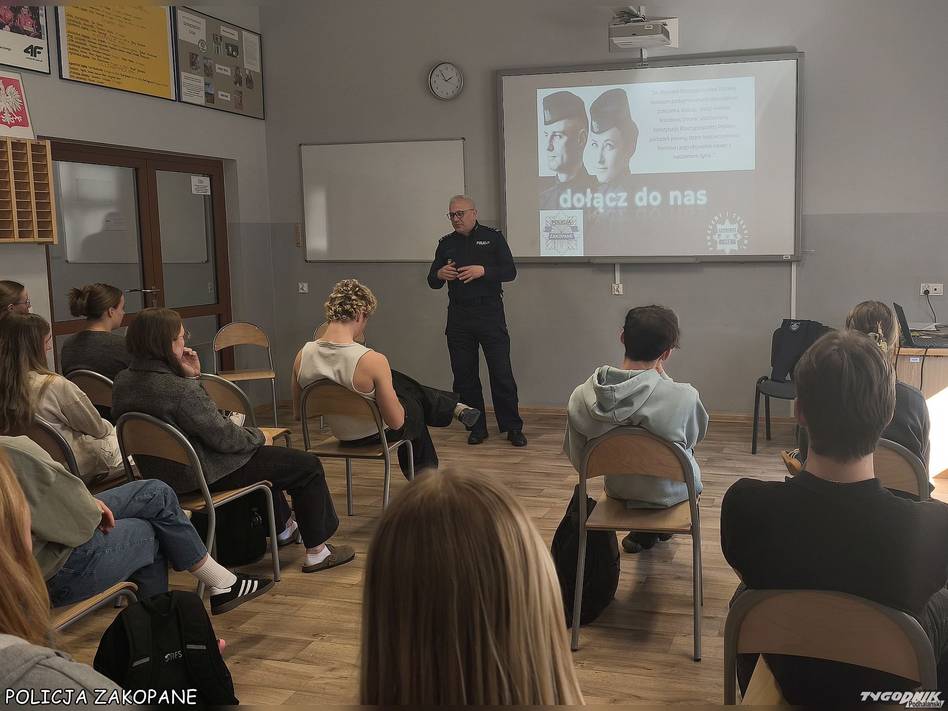 Komendant Powiatowy Policji w Zakopanem spotkał się z uczniami klas maturalnych Zespołu Szkół Mistrzostwa Sportowego w Zakopanem, aby zachęcić młodzież do wstąpienia w szeregi policji. Podczas spotkania przedstawiono m.in. specyfikę służby, proces rekrutacji oraz warunki finansowe oferowane funkcjonariuszom.