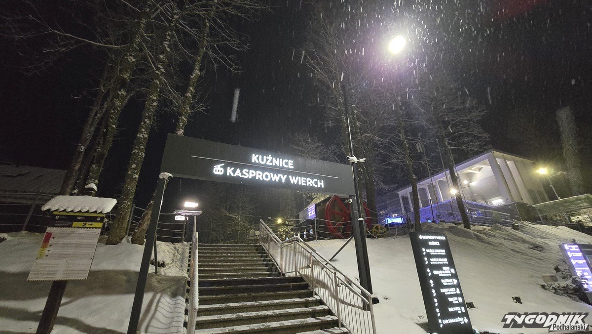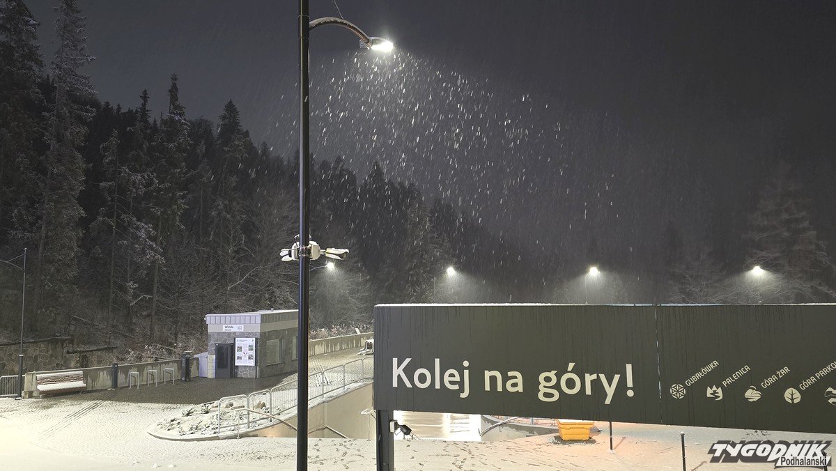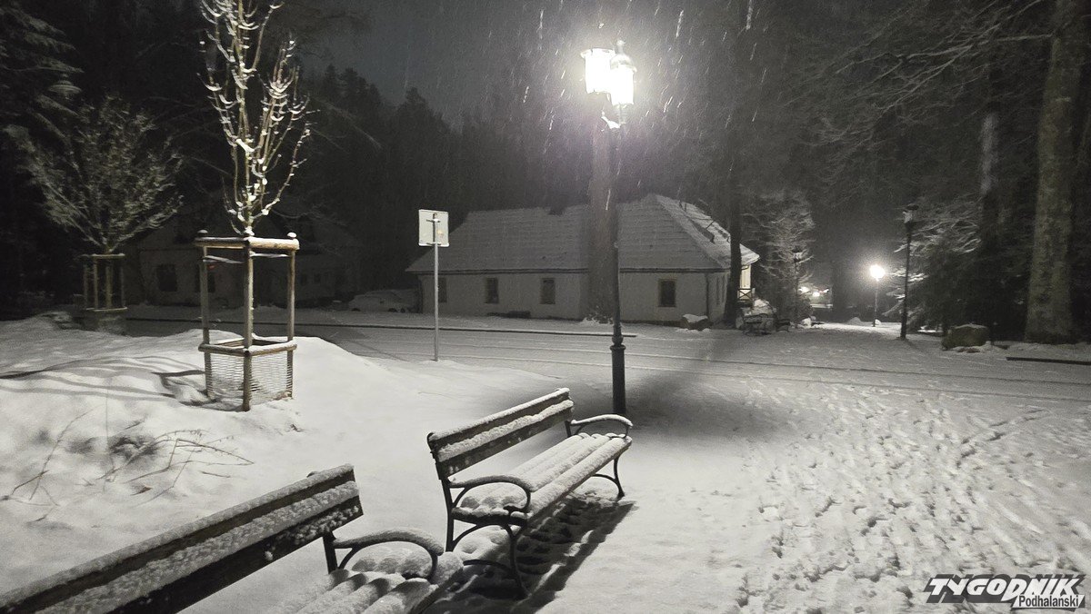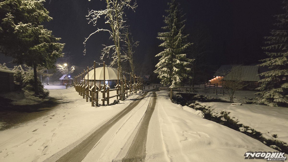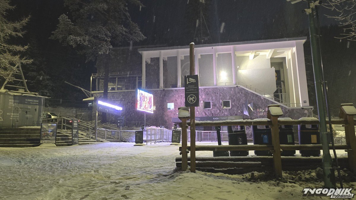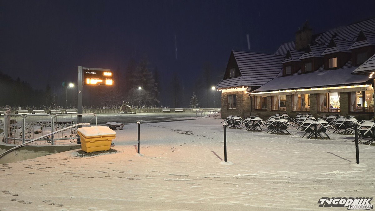 Spadło tu już kilka centymetrów śniegu. Temperatura niewiele przekracza 0 st. C. Wieczorem opady będą zanikać, a w środę zapowiadane jest słońce i ocieplenie. Kuźnice po zmroku niemal zupełnie puste i zimowo piękne. Zobaczcie zdjęcia i wideo.