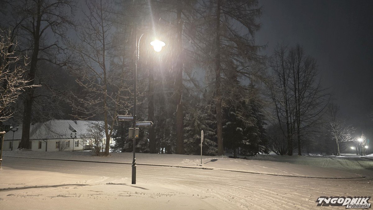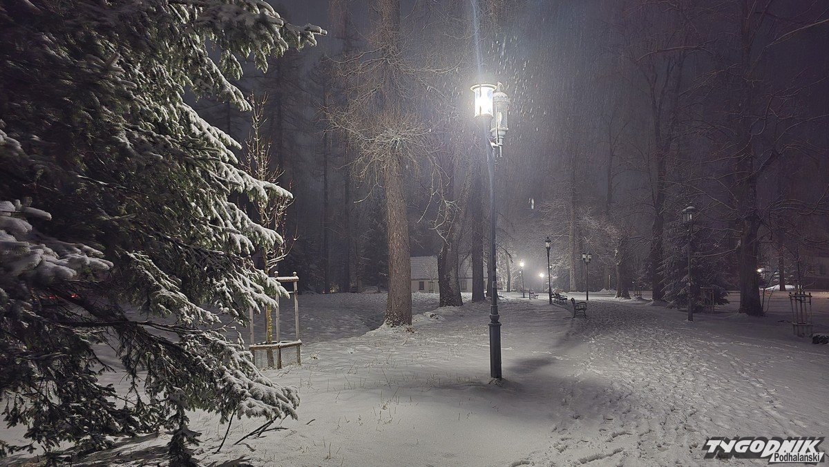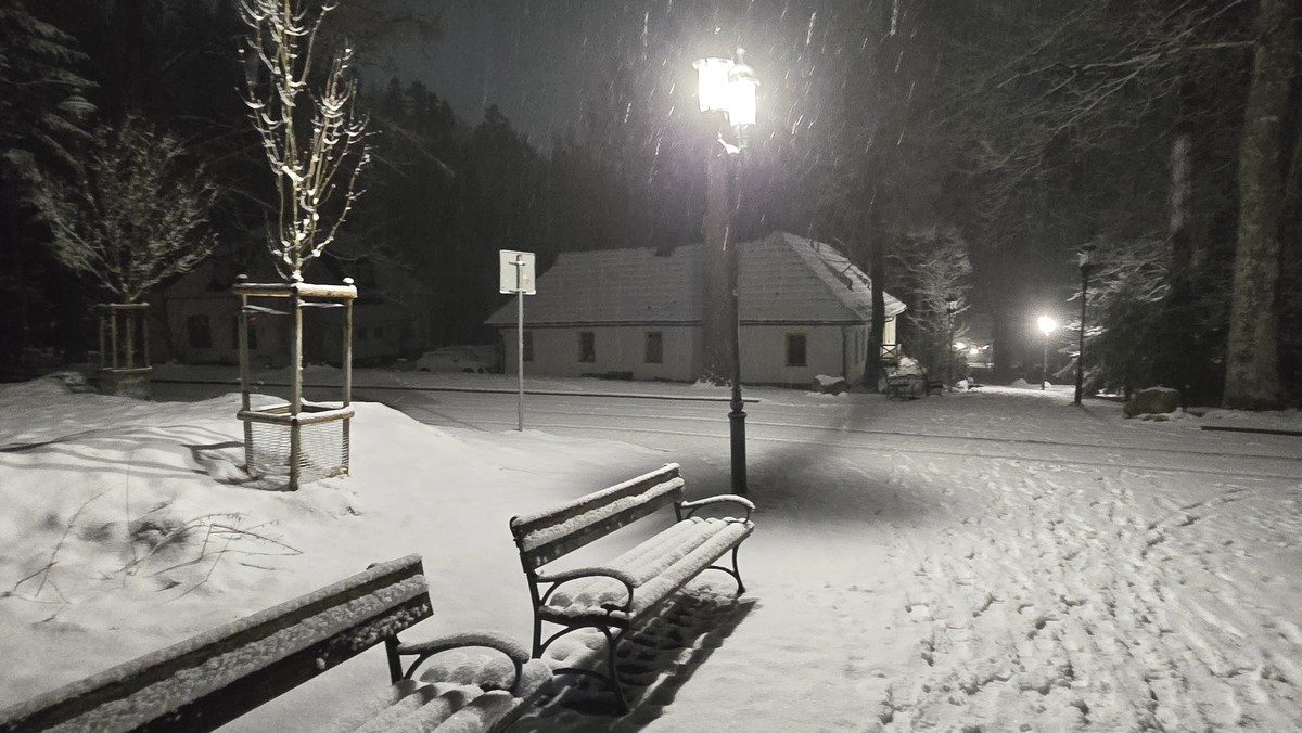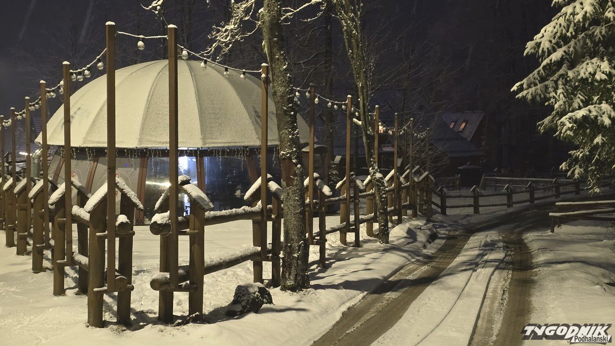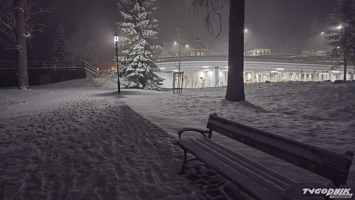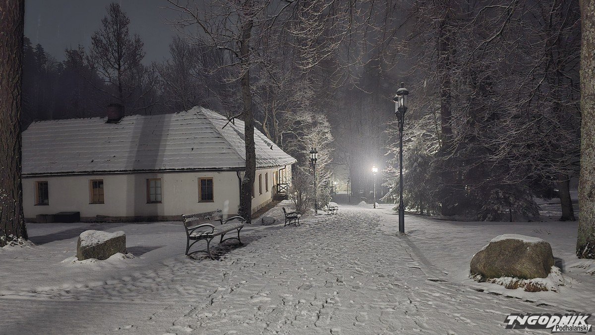 Spadło tu już kilka centymetrów śniegu. Temperatura niewiele przekracza 0 st. C. Wieczorem opady będą zanikać, a w środę zapowiadane jest słońce i ocieplenie. Kuźnice po zmroku niemal zupełnie puste i zimowo piękne. Zobaczcie zdjęcia i wideo.