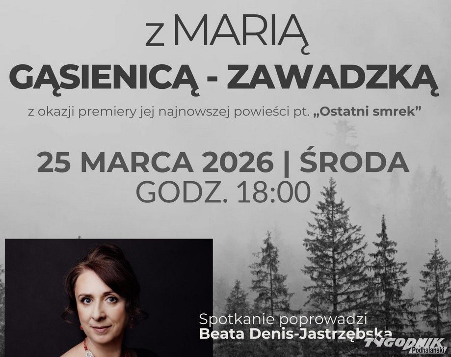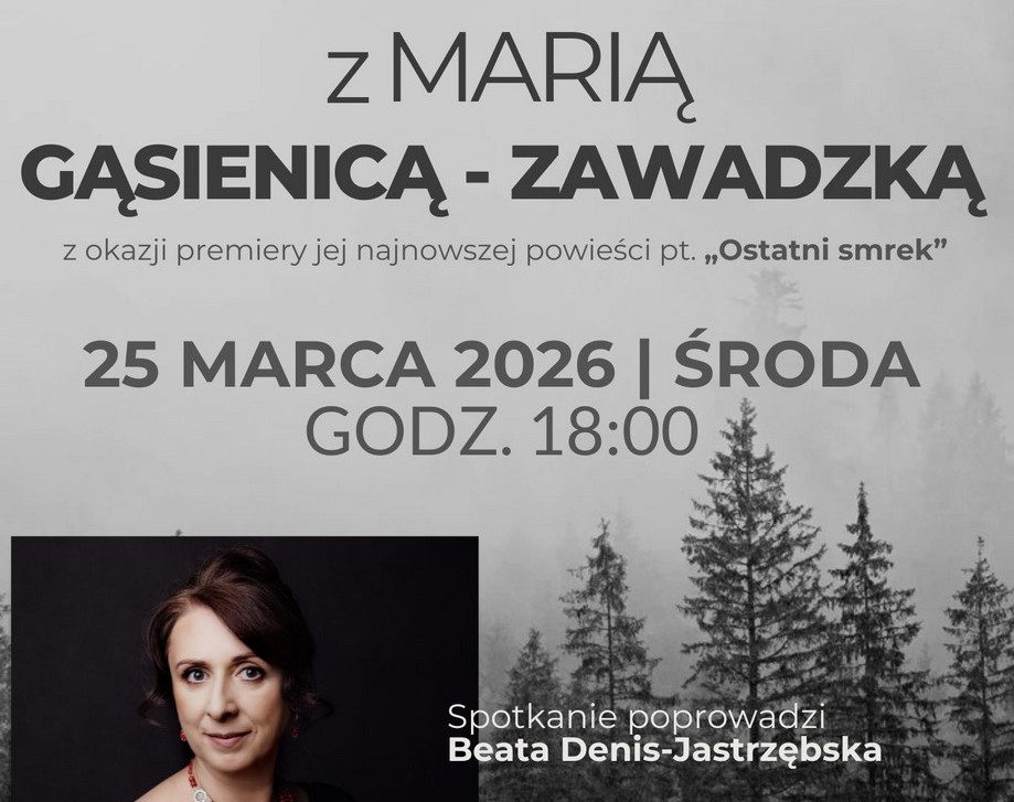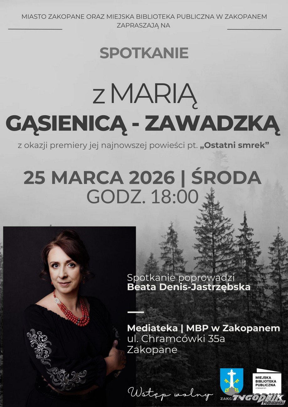 Miejska Biblioteka Publiczna w Zakopanem zaprasza na spotkanie autorskie z Marią Gąsienicą-Zawadzką, które odbędzie się 25 marca. Wydarzenie towarzyszy premierze jej najnowszej powieści "Ostatni smrek".