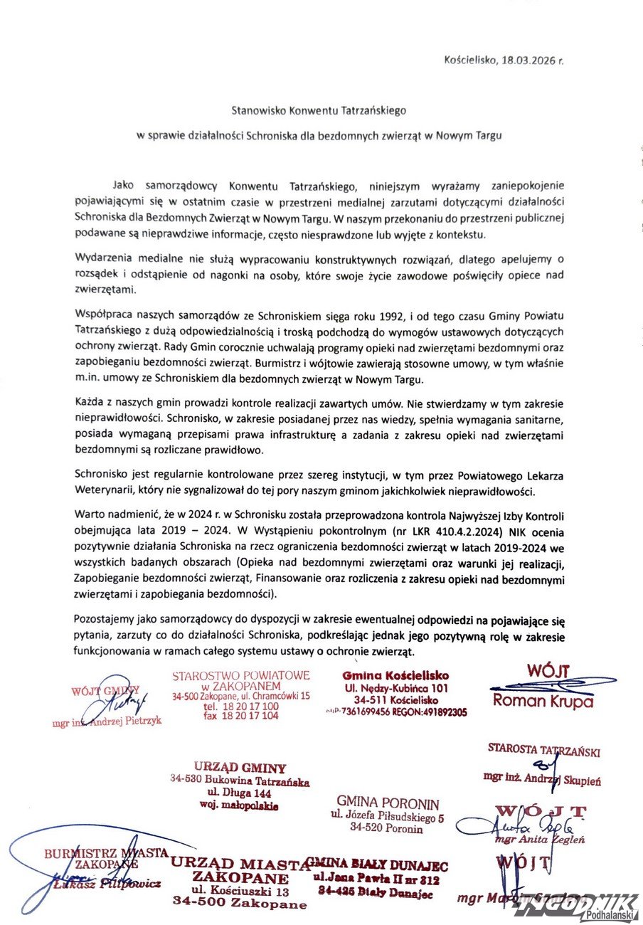 W oświadczeniu podkreślono, że współpraca gmin powiatu tatrzańskiego ze schroniskiem trwa nieprzerwanie od 1992 roku i odbywa się w oparciu o corocznie przyjmowane programy opieki nad zwierzętami bezdomnymi. Samorządy regularnie kontrolują realizację umów i – jak zaznaczono – nie stwierdziły żadnych nieprawidłowości. Schronisko spełnia wymagania prawne i sanitarne, posiada odpowiednią infrastrukturę, a jego działalność jest właściwie rozliczana.