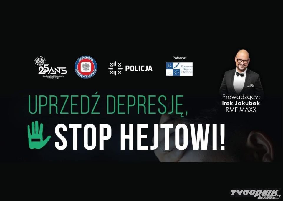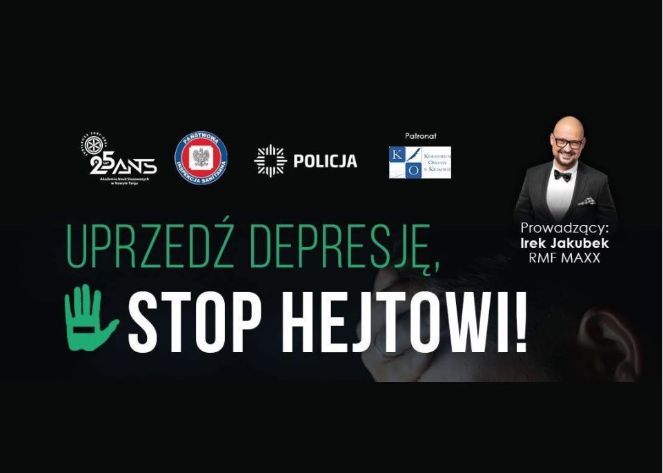 Komenda Powiatowa Policji w Nowym Targu wspólnie z Powiatową Stacją Sanitarno-Epidemiologiczną w Nowym Targu oraz Akademią Nauk Stosowanych w Nowym Targu i partnerami zaprasza na konferencję: "Uprzedź depresję - STOP hejtowi!".