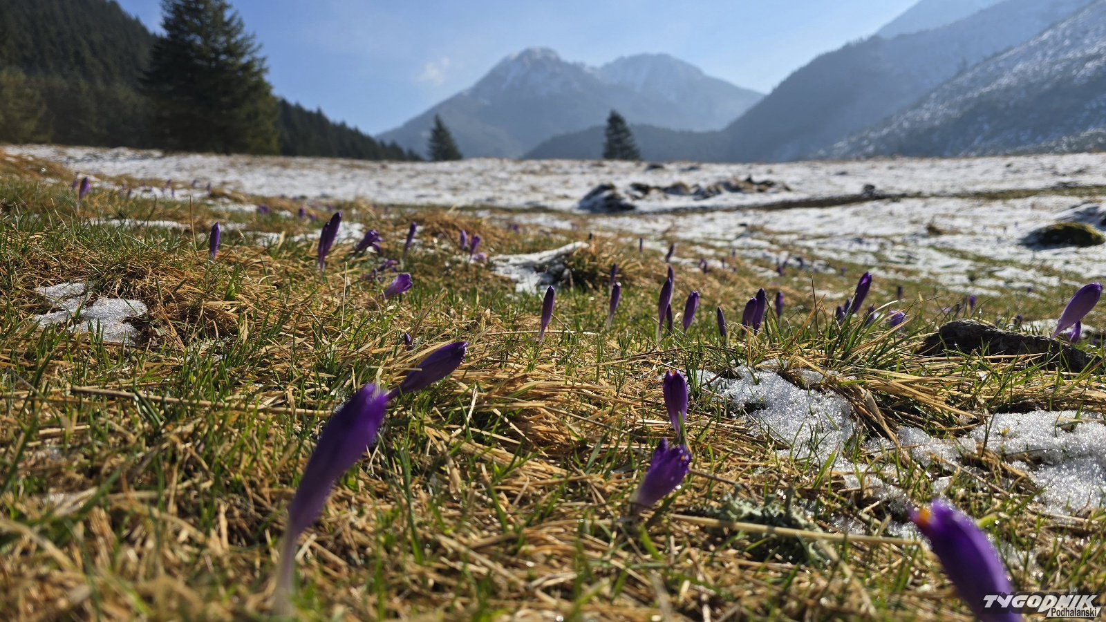Pierwszy dzień wiosny na Podhalu. Krokusy coraz śmielej wychodzą na hale