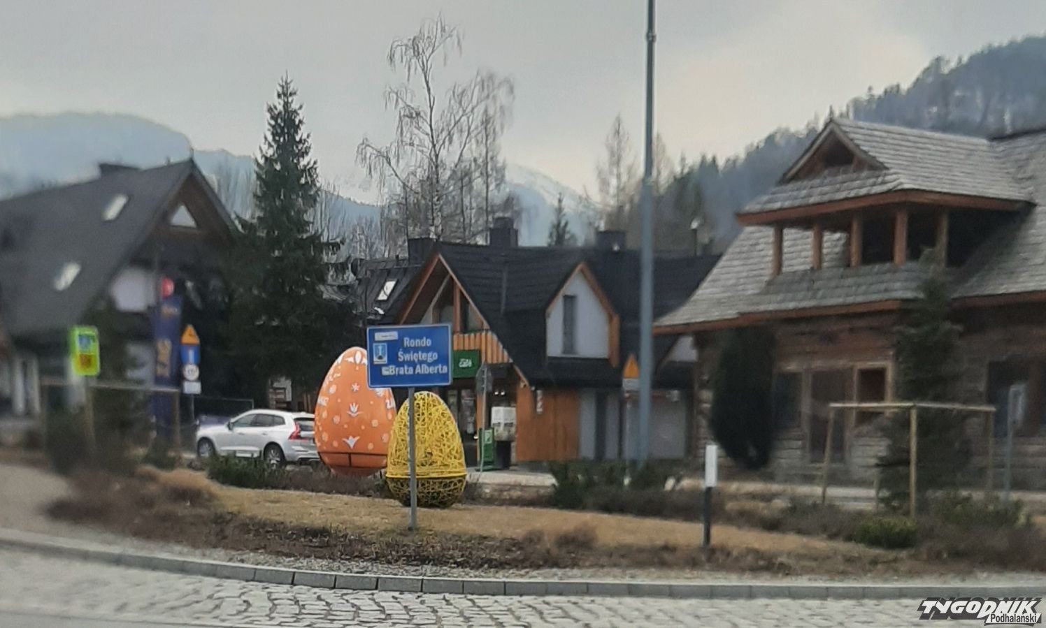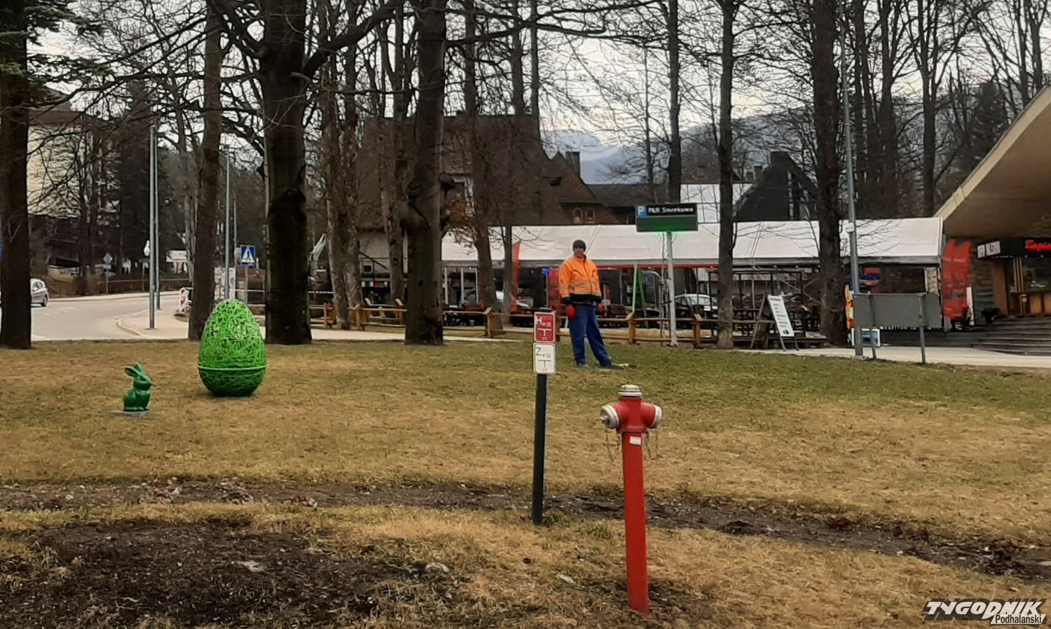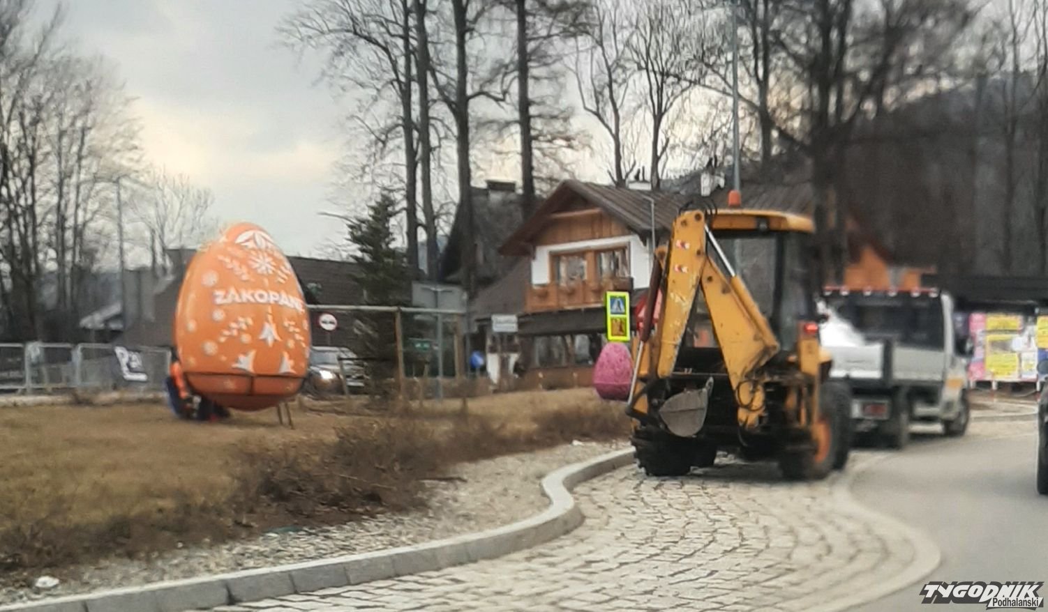 Zakopane stroi się na nadchodzący okres Świąt Wielkanosnych, na rondzie przy dworcu kolejowym montowane są kolorowe jaja i zajączki.