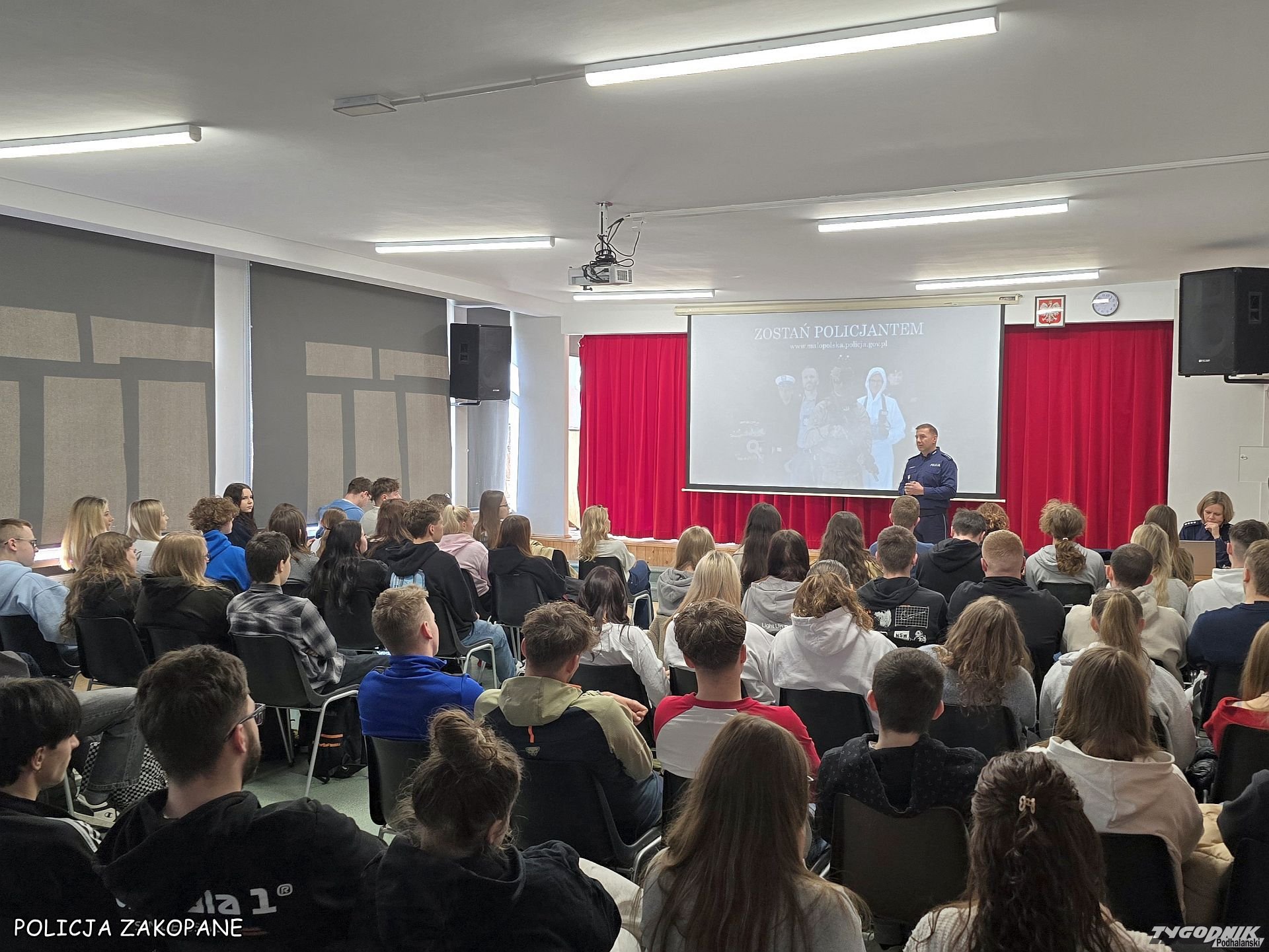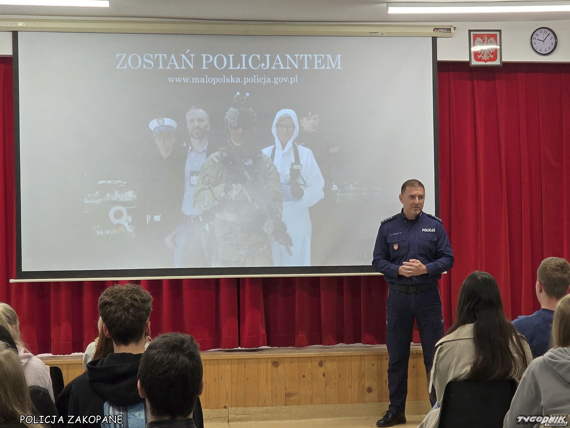 W Zespole Szkół Hotelarsko-Turystycznych w Zakopanem odbyło się spotkanie uczniów klas maturalnych z I Zastępcą Komendanta Powiatowego Policji oraz funkcjonariuszami. Spotkanie przybliżyło młodzieży specyfikę służby w Policji i zachęcało do rozważenia kariery w formacji mundurowej.