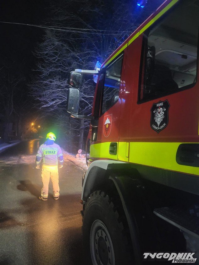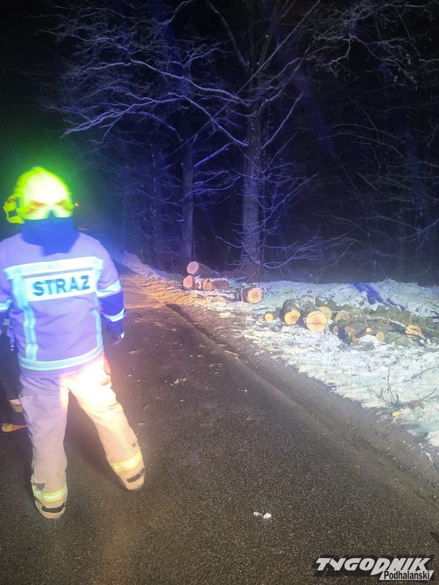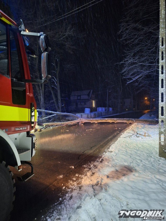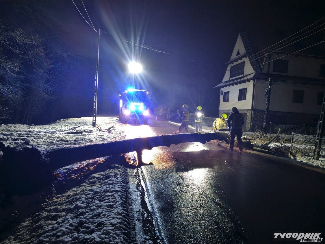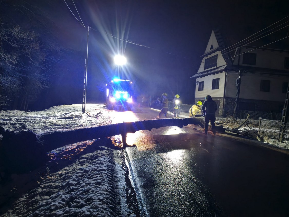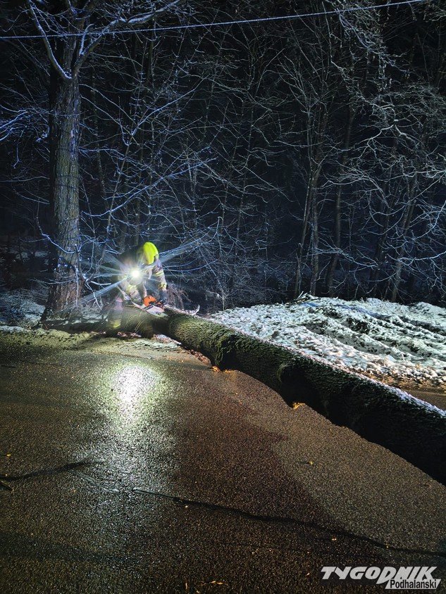 W nocy strażacy interweniowali przy usuwaniu powalonego drzewa, które całkowicie zablokowało przejazd drogą i uszkodziło linię energetyczną. Do zdarzenia doszło o godzinie 00:47.