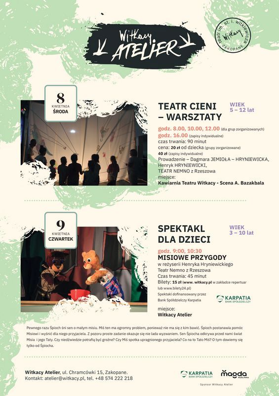 Z kolei w czwartek 9.04 Witkacy Atelier zaprasza na spektakl „Misiowe przygody” w reżyserii Henryka Hryniewickiego (o godz. 9 i 10.30). To propozycja dla dzieci w wieku 3-10 lat. O czym jest bajka? Pewnego razu Śpioch śni sen o małym misiu. Miś ten ma ogromny problem, ponieważ nie ma się z kim bawić. Śpioch postanawia pomóc Misiowi i wyśnić dla niego przyjaciela. Z pozoru proste zadanie okazuje się nie lada wyzwaniem. Sen Śpiocha odkrywa przed widzami świat Misia i jego Taty. Czy niedźwiedzie potrafią być groźne? Czy Miś spotka upragnionego przyjaciela? Co na to Tato Miś? O tym dowiecie się tylko od Śpiocha.