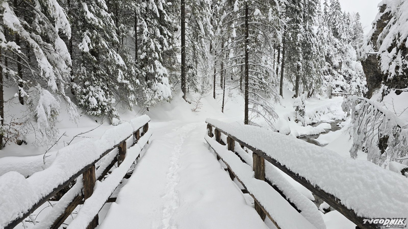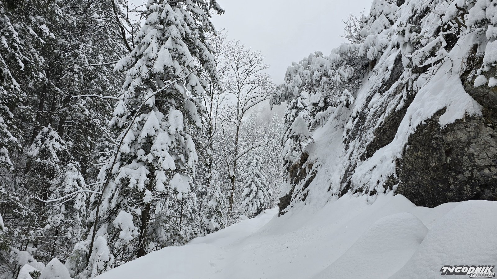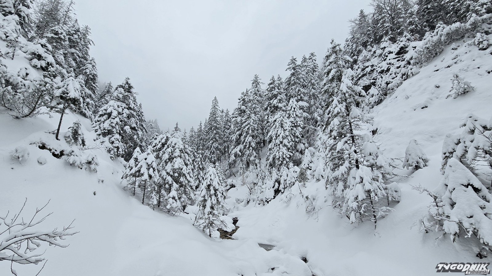 Na Kasprowym Wierchu spadło w ciągu doby ponad 30 cm śniegu. Pokrywa śniegu przekracza tam 130 cm, w Zakopanem leży 35 cm. Dziś rano wybraliśmy się do urokliwej Doliny Białego. Na szlaku ślady tylko paru osób. Krajobrazy przepiękne. Świerki, zbocza doliny oblepione grubą warstwą śniegu. Odradzamy wychodzenie wyżej. Szlaki są nieprzetarte. Obowiązuje trzeci stopień zagrożenia lawinowego.