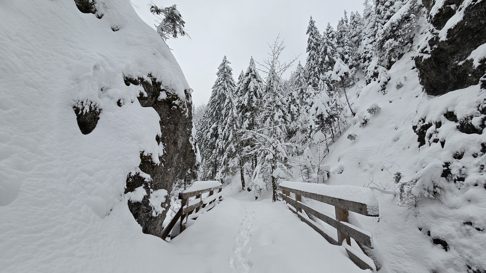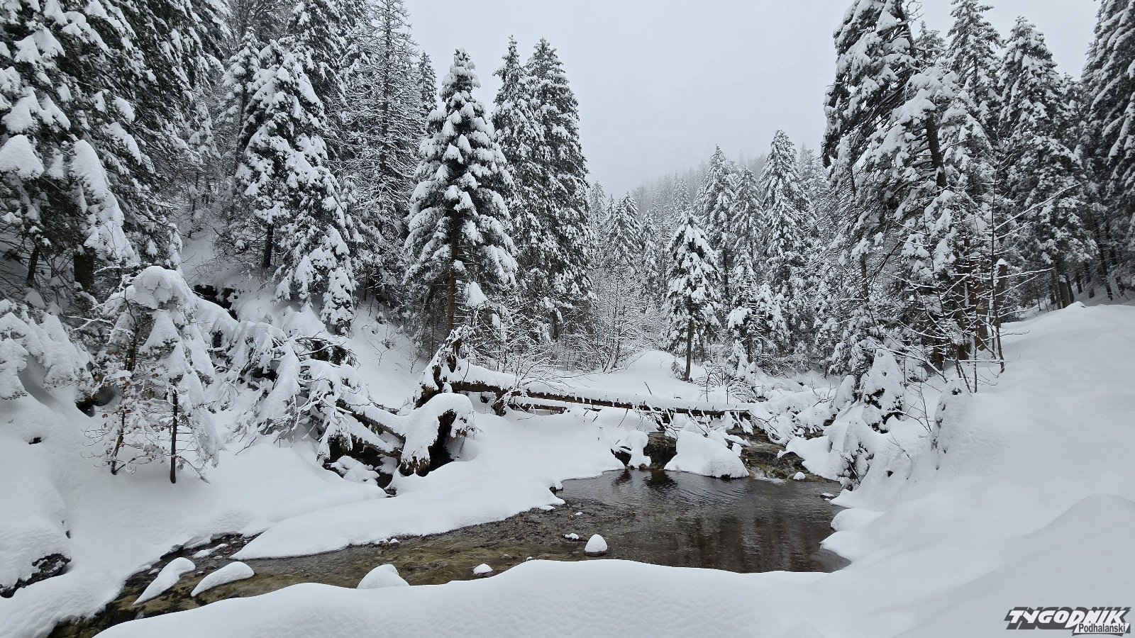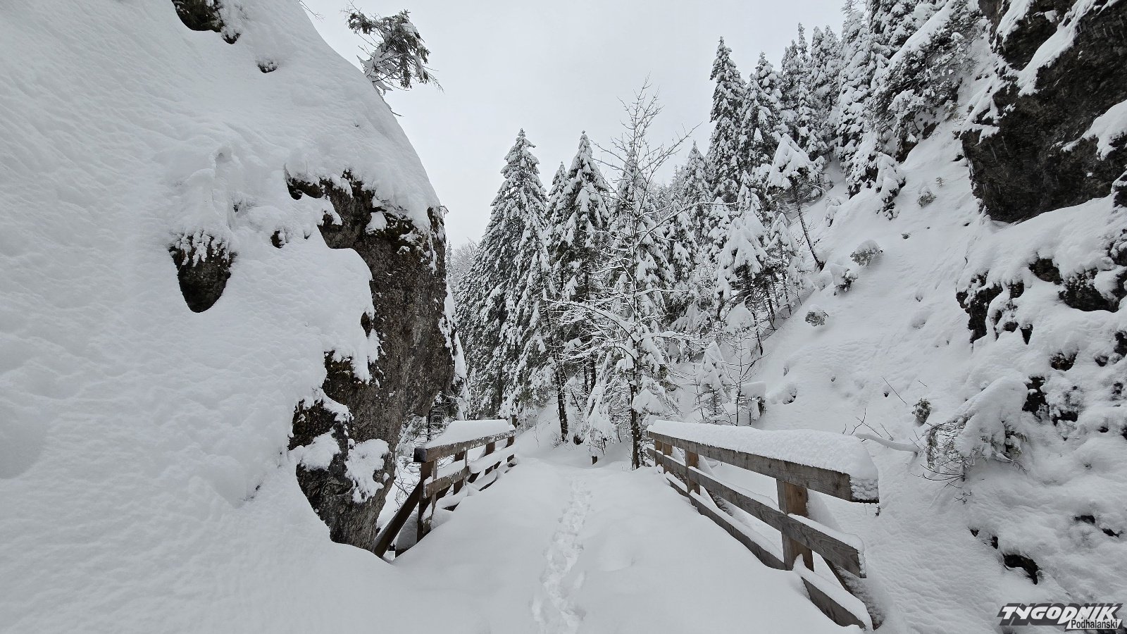 Na Kasprowym Wierchu spadło w ciągu doby ponad 30 cm śniegu. Pokrywa śniegu przekracza tam 130 cm, w Zakopanem leży 35 cm. Dziś rano wybraliśmy się do urokliwej Doliny Białego. Na szlaku ślady tylko paru osób. Krajobrazy przepiękne. Świerki, zbocza doliny oblepione grubą warstwą śniegu. Odradzamy wychodzenie wyżej. Szlaki są nieprzetarte. Obowiązuje trzeci stopień zagrożenia lawinowego.