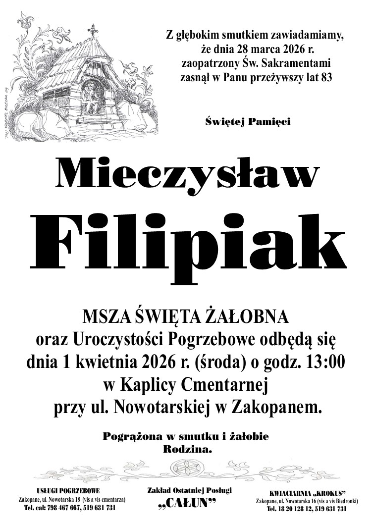 2026-03-30 11:35 Tak wygląda chodnik na Jaszczurówce 2026-03-30 11:05 Zawalony dach pustostanu w Zakopanem 2026-03-30 10:59 Taksówkarz wjechał w drzewo. Policja podaje szczegóły wypadku 1 2026-03-30 10:01 Pierwszy telefon komórkowy dla dziecka? Sprawdź za czym warto się rozejrzeć! 2026-03-30 10:00 Teatr dla najmłodszych w Witkacy Atelier 2026-03-30 09:00 O co chodzi w planach ogólnych? Ściąga krok po kroku 2026-03-30 07:59 Misterium mimo niepogody. Przejmująca Droga Krzyżowa na ulicach Krempach (ZDJĘCIA) 2026-03-29 22:52 Trzeci wypadek w niedzielę. Samochód uderzył w barierki 2026-03-29 21:30 Droga Krzyżowa na Krupówkach (ZDJĘCIA, WIDEO) 6 2026-03-29 21:01 Odcięci 5 2026-03-29 20:00 Porzucony telewizor na ulicy w Zakopanem 15 2026-03-29 19:00 Miętusiańskie palmy pod sklepienie 2026-03-29 18:30 Zimowe krajobrazy w Tatrach. Tak było dziś w Jaworzynce (WIDEO) 2026-03-29 17:30 Oficjalna seria powieści festiwalu Tomorrowland. Mamy dla Was książki 2026-03-29 17:27 Samochód wypadł z zakopianki 2 2026-03-29 17:17 Wypadek w Czarnym Dunajcu. Cztery osoby ranne 2026-03-29 17:00 Pożary, tajemnice i Tygodnik Podhalański. Do wygrania książki Marii Gąsienicy-Zawadzkiej 2026-03-29 16:30 Największa palma Bachledów-Chowańców mierzyła ponad pięć metrów (WIDEO) 1 2026-03-29 16:04 36-latka próbowała podpalić dom i zabić cztery osoby. Trafi do szpitala psychiatrycznego 1 2026-03-29 15:50 Ostatni skok i pożegnanie Kamila Stocha (ZDJĘCIA) 3 2026-03-29 15:00 Zasłony, muzyka, koncert (WIDEO) 2026-03-29 14:20 Konkurs na Najpiękniejszą Wielkanocną Palmę w Witowie (ZDJĘCIA) 2026-03-29 13:59 Zasypane wjazdy na ul. Żeromskiego. Starsze osoby nie dają rady (WIDEO) 18 2026-03-29 13:25 Na Podhalu odbędą się obchody Wieczerzy Pańskiej. Otwarte zaproszenie dla mieszkańców 2026-03-29 13:00 W Wielką Sobotę rozstrzygnięcie konkursu na Tradycyjny Koszyczek Wielkanocny 2 2026-03-29 12:03 Schronisko i samozwańczy inspektor 7 2026-03-29 11:24 Kycicki - tradycyjne orawskie palmy 1 2026-03-29 11:16 Kamil Stoch oddał swój ostatni skok. Dziękujemy mistrzu za te lata wzruszeń i sukcesów 1 2026-03-29 09:59 Dziś ostatni konkurs, wczoraj pożegnanie. Kamil Stoch w Kranjskiej Gorze (WIDEO) 1 2026-03-29 08:59 Nowy rozkład lotów w Balicach. 173 połączenia, 119 miast, 39 państw 2 2026-03-29 08:00 Zgłoszenia do "Bajklusia" tylko do 1 kwietnia 1 2026-03-28 21:00 Nie każ im na siebie dłużej czekać (WIDEO) 2026-03-28 20:30 Takie cudeńka na ochotnickim jarmarku 2026-03-28 20:00 Nowy Targ. XVIII Festiwal Nauki w Metalce 1 2026-03-28 19:00 Ogarnąć nieskończoność. Biblia w ilustracji 3 2026-03-28 17:59 Ostatni drużynowy konkurs Kamila Stocha (ZDJĘCIA) 3 2026-03-28 17:00 Czy w niedzielę 29 marca zrobimy zakupy w dużych sklepach 5 2026-03-28 16:00 Goła pani w Czerwonym Dworze. Niecodzienna kronika Zdzisława Walczaka (WIDEO) 2026-03-28 15:02 Zimowe krajobrazy w Dolinie Białego. Trzeci stopień zagrożenia lawinowego (WIDEO) 2026-03-28 14:30 Cztery razy tak. Sukces Duetu z Pienin 3 2026-03-28 14:00 Ustup, Smrekowa, Aleje 3-go Maja, Zaryckiego i Mrowce - nieruchomości przeszły jednogłośnie 3 2026-03-28 13:04 Trzy osoby trafiły do szpitala 2026-03-28 12:39 Nagły powrót zimy zagraża ptakom. Bez naszej pomocy nie przetrwają najbliższych dni 4 2026-03-28 12:15 Miasto odśnieżyło newralgiczny mostek 5 2026-03-28 11:46 W pierwszej serii Polacy skakali źle, w drugiej katastrofalnie 1 2026-03-28 11:00 Szpulki potrzebują milionowych nakładów, by osiągnąć nowoczesne standardy 6 2026-03-28 10:00 Przegląd Palm Wielkanocnych w Domu Ludowym 2026-03-28 08:59 Zmiana czasu. Dziś śpimy godzinę krócej 20 2026-03-28 08:27 Przebłyski słońca nad Tatrami, ale warunki turystyczne bardzo trudne 2026-03-28 08:00 "Szepty lasu" już niebawem w kinach