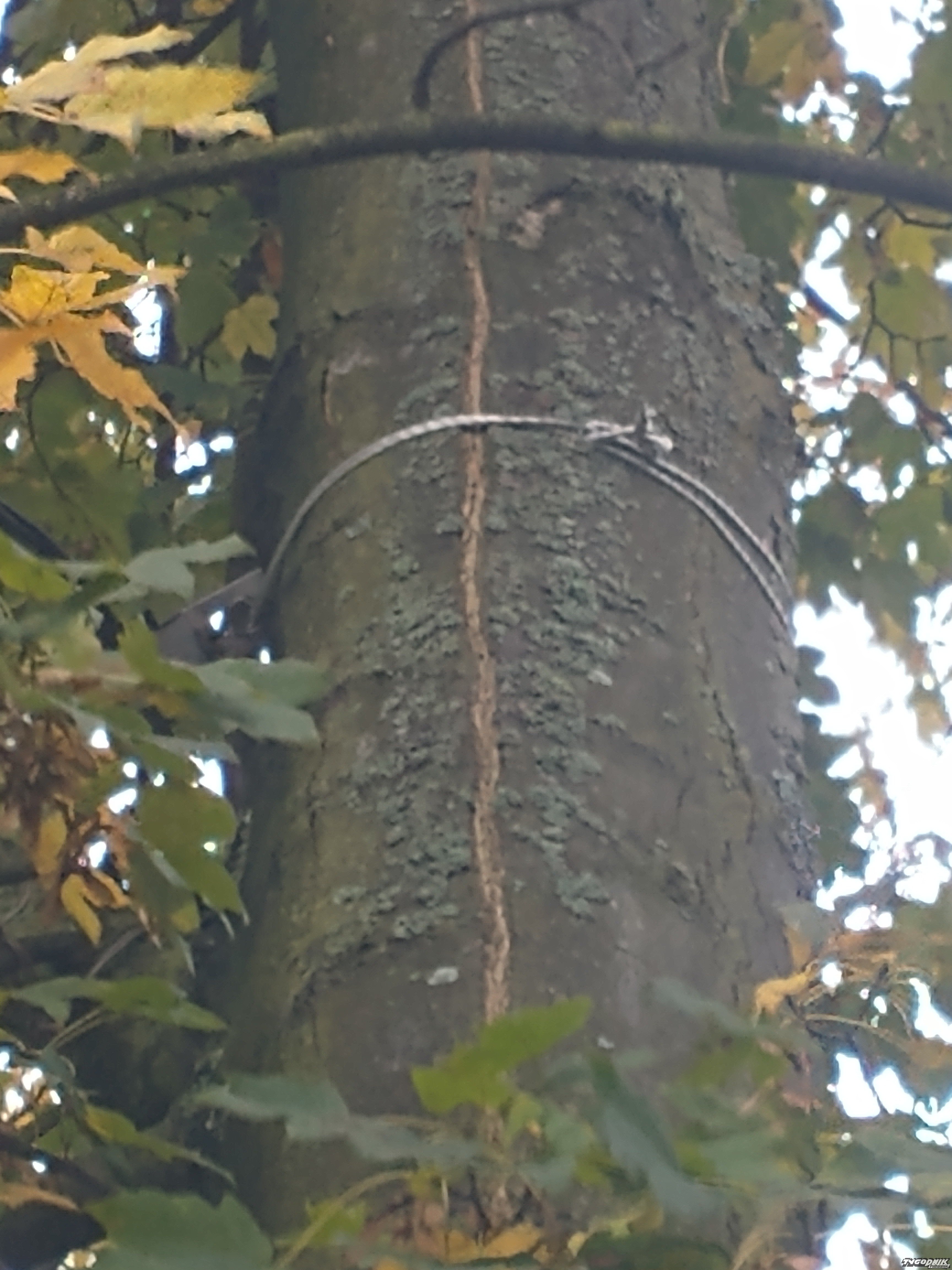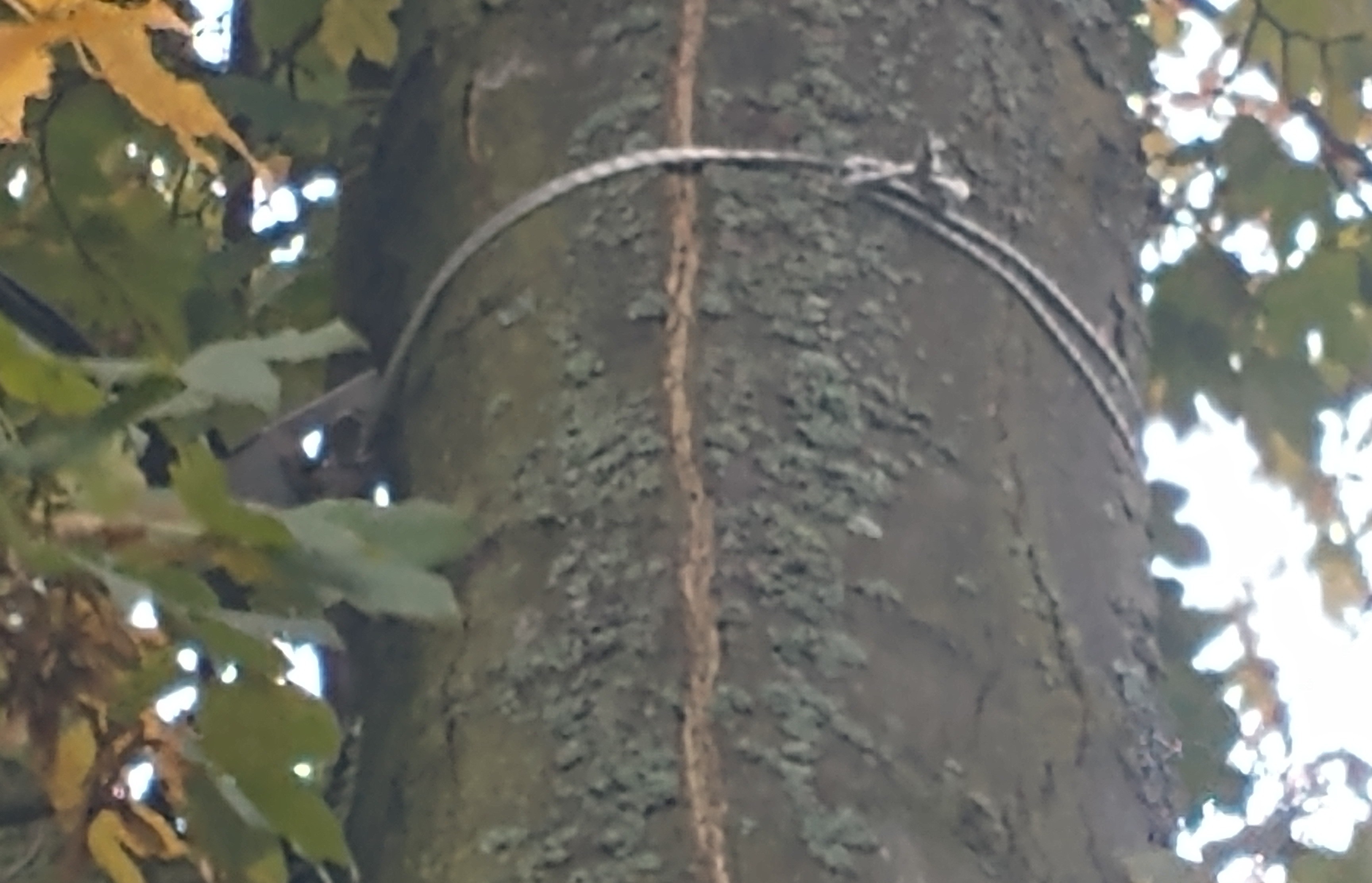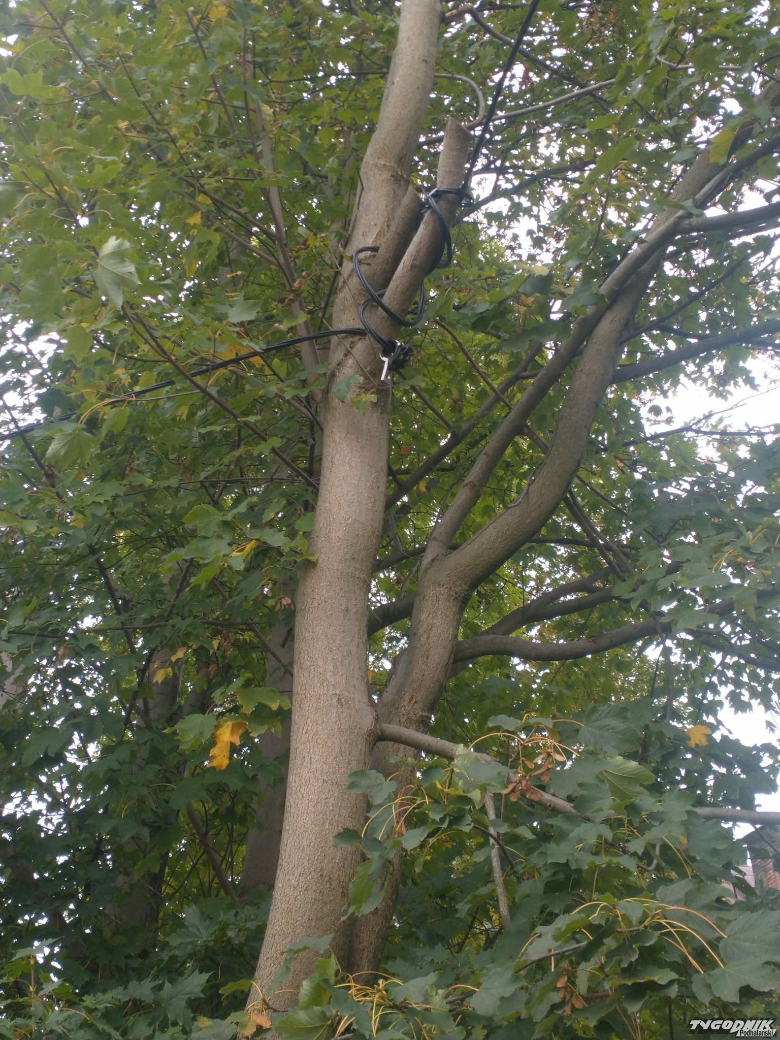 Mężczyzna relacjonował, że na kilkunastu drzewach – klonach i jaworach – przy jego budynku pojawił się biały kabel energetyczny.