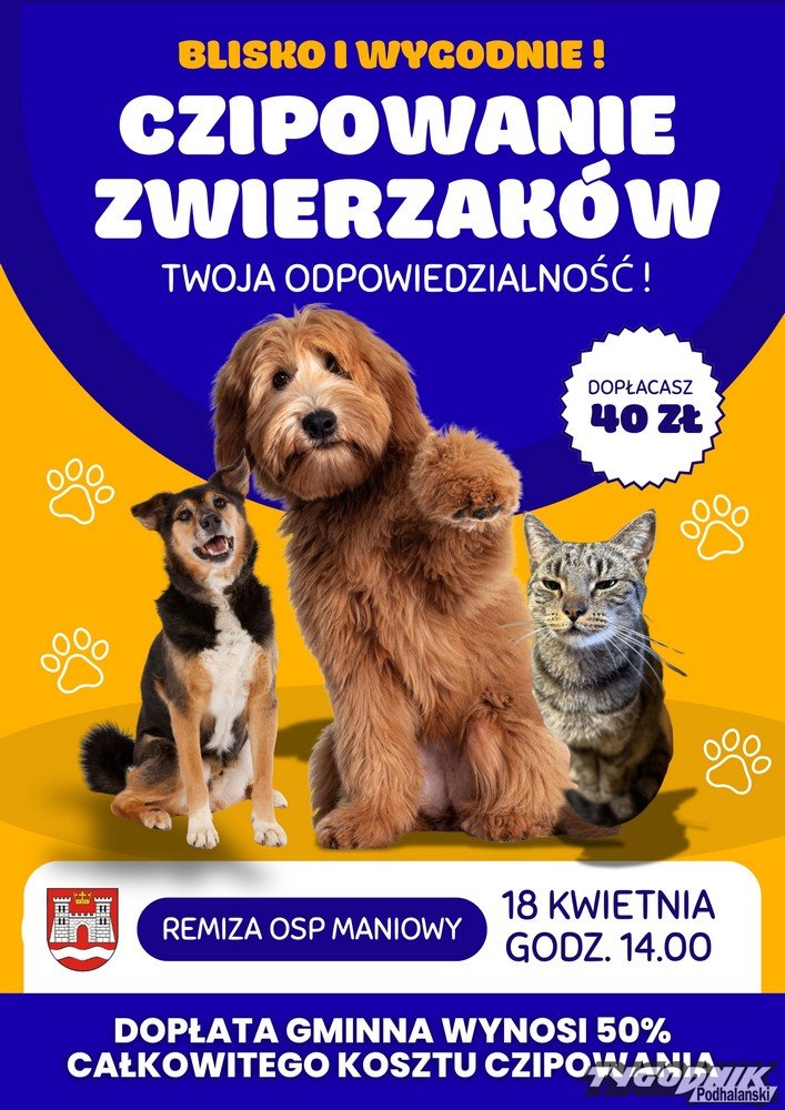 Akcja odbędzie się 18 kwietnia 2026 roku przy remizie OSP w Maniowach. Czipowanie będzie prowadzone od godziny 14:00.