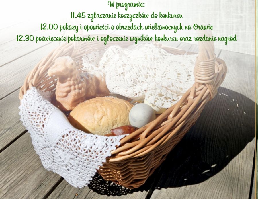 Koszyczki do konkursu zgłaszać można w sobotę od godziny 11.45. W południe odbędą się pokazy i opowieści o obrzędach wielkanocnych na Orawie przygotowane przez Małolipnicką Rodzinę Kolpinga. Poświęcenie pokarmów i ogłoszenie wyników konkursu oraz rozdanie nagród o godzinie 12.30.